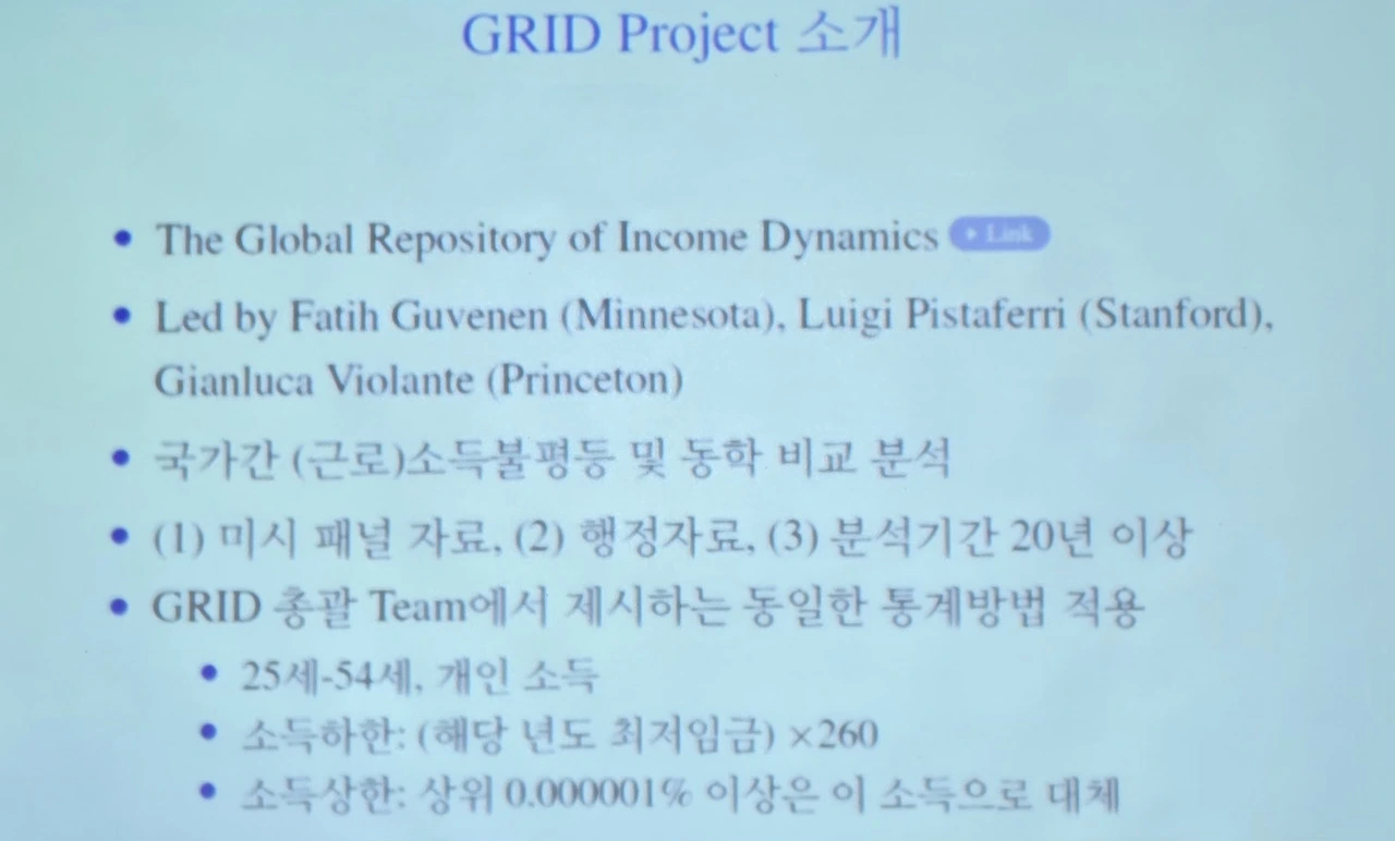 그리드(GRID) 프로젝트는 세계적으로 통일된 기준 하에 최소 20년간 나와 있는 전수조사에 가까운 행정자료(국세청)를 모아서 불평등에 관한 데이터베이스를 구축하는 프로젝트다. 13개 국가가 처음 참여했고, 현재 더 많은 국가들이 참여한 2단계 분석이 진행 중이다. 한국도 2단계부터 참여 중이다.