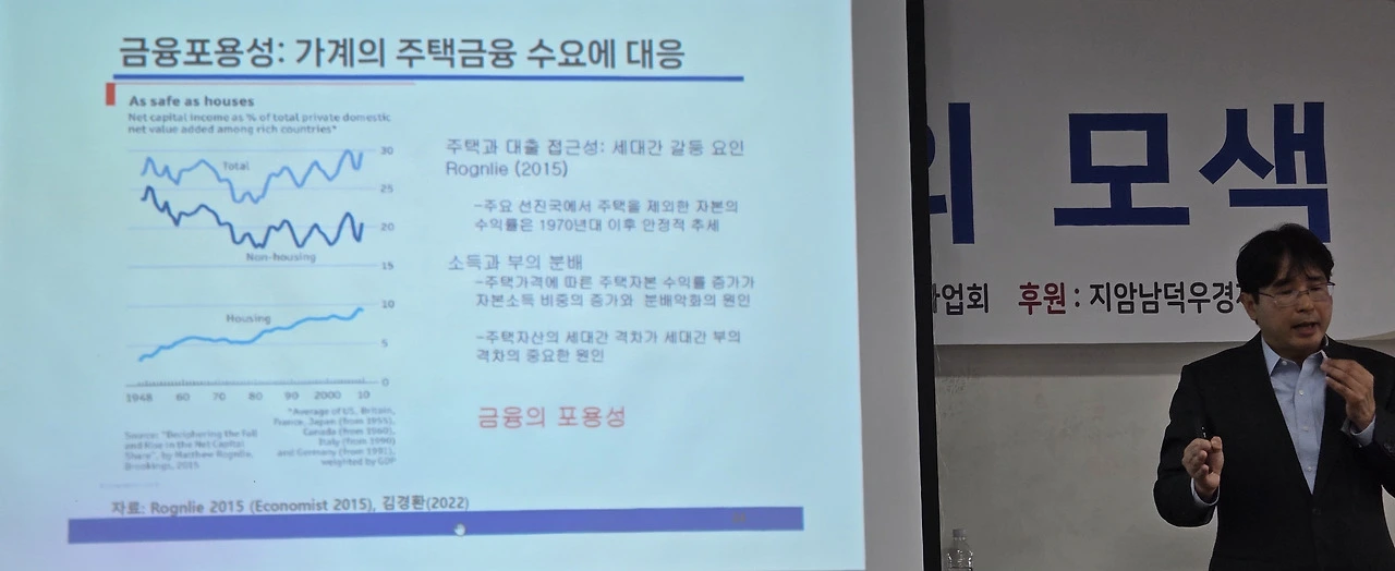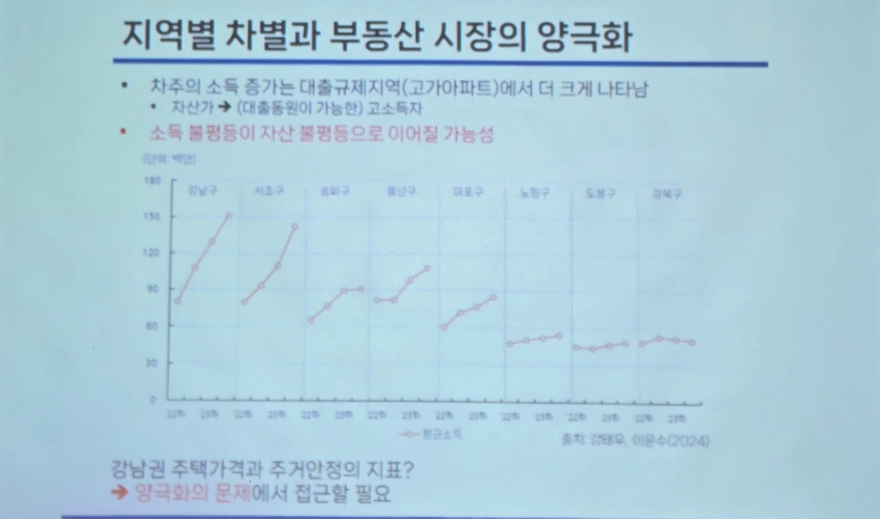 이 교수는 지난 정부부터 이어진 대출 규제가 젊은층의 자산형성 기회를 박탈하고 있다고도 지적했다. 그는 "연봉 1억원에 대기업을 다닌다고 해도 신용대출 없이는 3040대가 정상적으로 집을 사는 것이 불가능하다"며 "소득은 있지만 자산 쌓은 게 없는 소위 '대기업 흙수저'는 대출 규제 때문에 2020년 부동산 호황기에도 집을 살 수 없었다. 소득 없어도 부모가 돈이 많아서 상급지 투자소득을 누린 이들에 비해 내 소득은 저 강남만큼 오르지 않는다는 상대적 박탈감을 가지는 것"이라고 말했다.