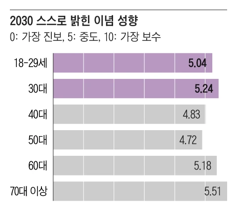 이번 정치 인식 조사에서 20대와 30대의 이념 성향 지수는 각각 5.04점과 5.24점이었다. 10점에 가까워질수록 보수 성향이 더욱 강하다는 뜻으로 40대가 4.83점, 50대 4.72점인 것과 대비됐다.