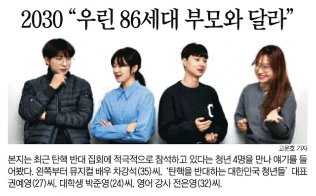 지난 5일 조선일보 1면에는 "2030 우린 86세대 부모와 달라"라는 제목의 기사가 올라왔다. 좌파 부모와 달리 우파로 성장한 2030 인터뷰였다. 첫 화두를 연 건 대학생 박준영(24) 씨였다. 박 씨는 2023년부터 정치에 관심을 갖게 됐는데 '86세대' 부모와 정치 현안으로 자주 부딪쳐서 집을 나왔다고 한다.