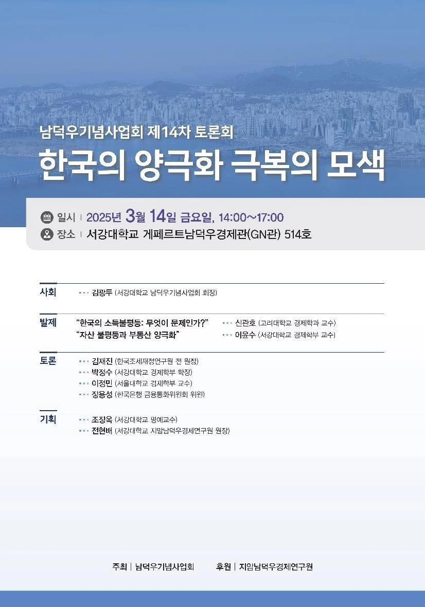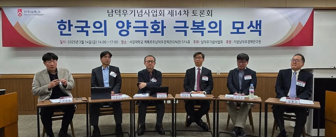 서강대학교 남덕우기념사업회(회장 김광두)는 지난 3월 14일(금) 서강대학교 게페르트남덕우경제관(GN관) 514호실에서 '한국의 양극화 극복의 모색'을 주제로 제14차 토론회를 개최했다.