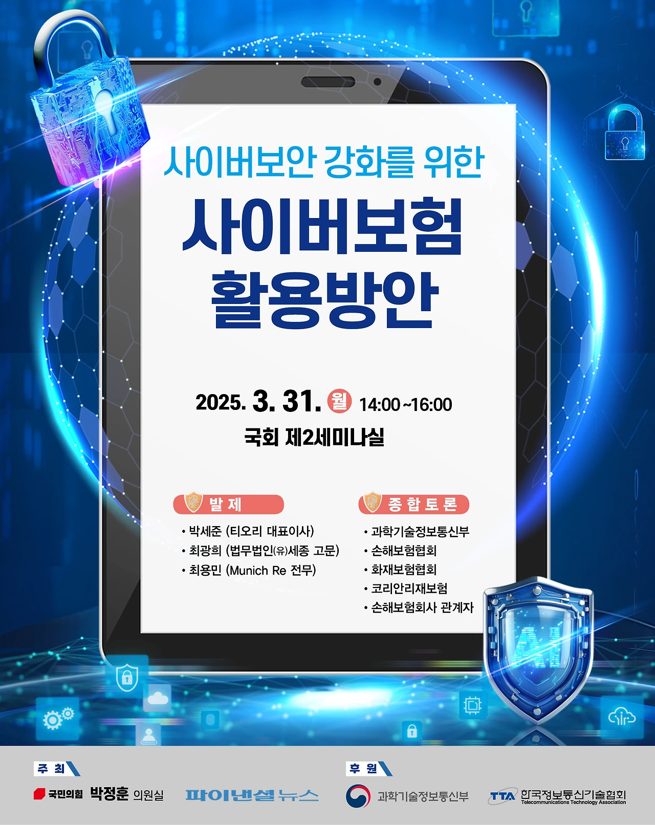 해킹 수법이 고도화되고 피해도 늘어나면서 기업들이 사이버보험을 적극 활용해야 한다는 목소리가 높아지고 있다. 기업들이 사이버보험을 통해 해킹·랜섬웨어 등 사이버 리스크 손실 보상 안전장치를 마련하는 동시에 가입 과정에서 진단 절차를 거쳐 기업의 보안 수준을 획기적으로 높일 수 있다는 지적이다. 기업들의 해킹 피해를 줄이기 위한 '사이버보안 강화를 위한 사이버보험 활용 방안' 세미나가 국민의힘 박정훈 의원과 파이낸셜뉴스 공동 주최로 3월 31일 국회의원회관 제2세미나실에서 열렸다. 이날 행사엔 국민의 힘 권영세 비상대책위원장과 권성동 원내대표가 축사를 하고, 같은 당 김기현·김성원 의원·최형두·배현진·임종득·우재준·김대식 의원(원내수석대변인) 등이 참석했다.