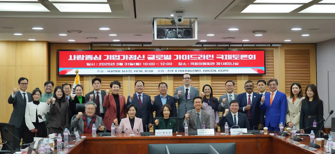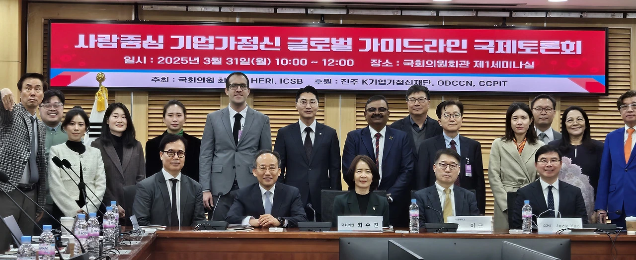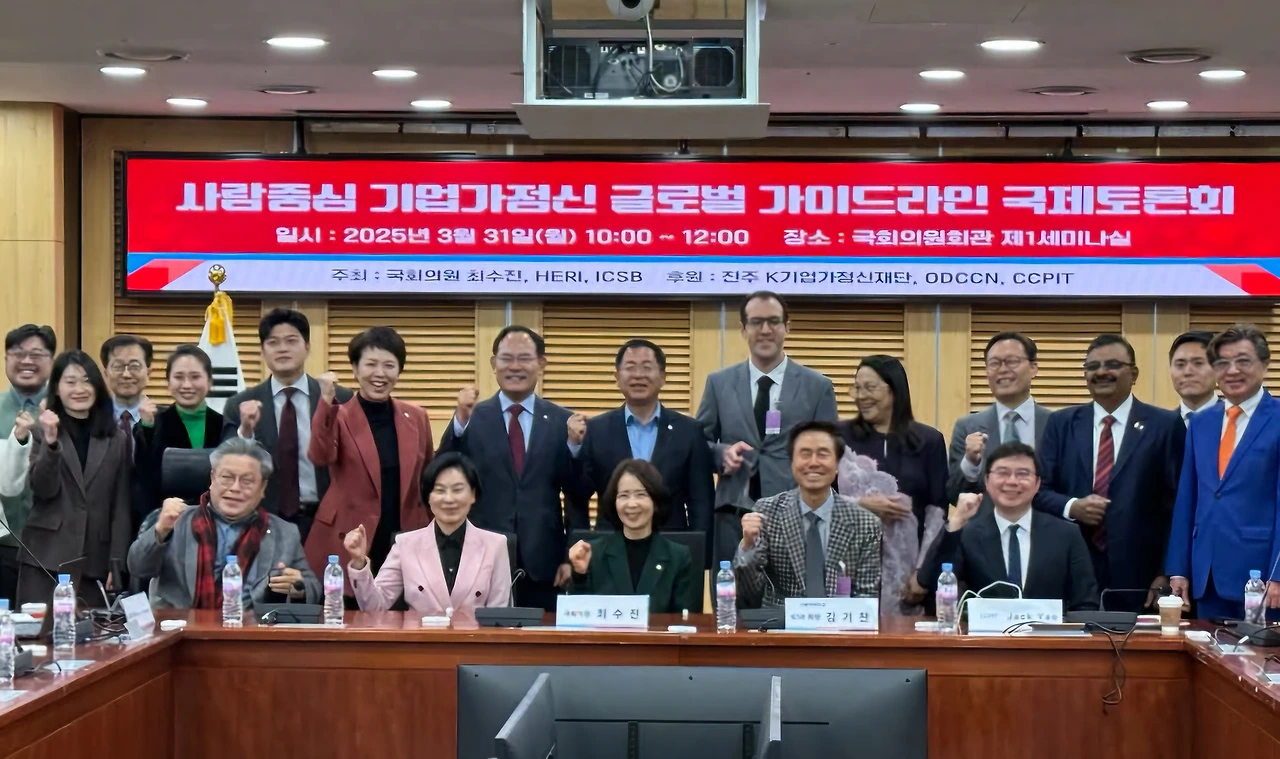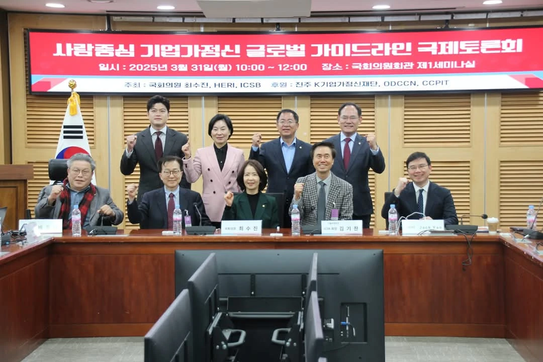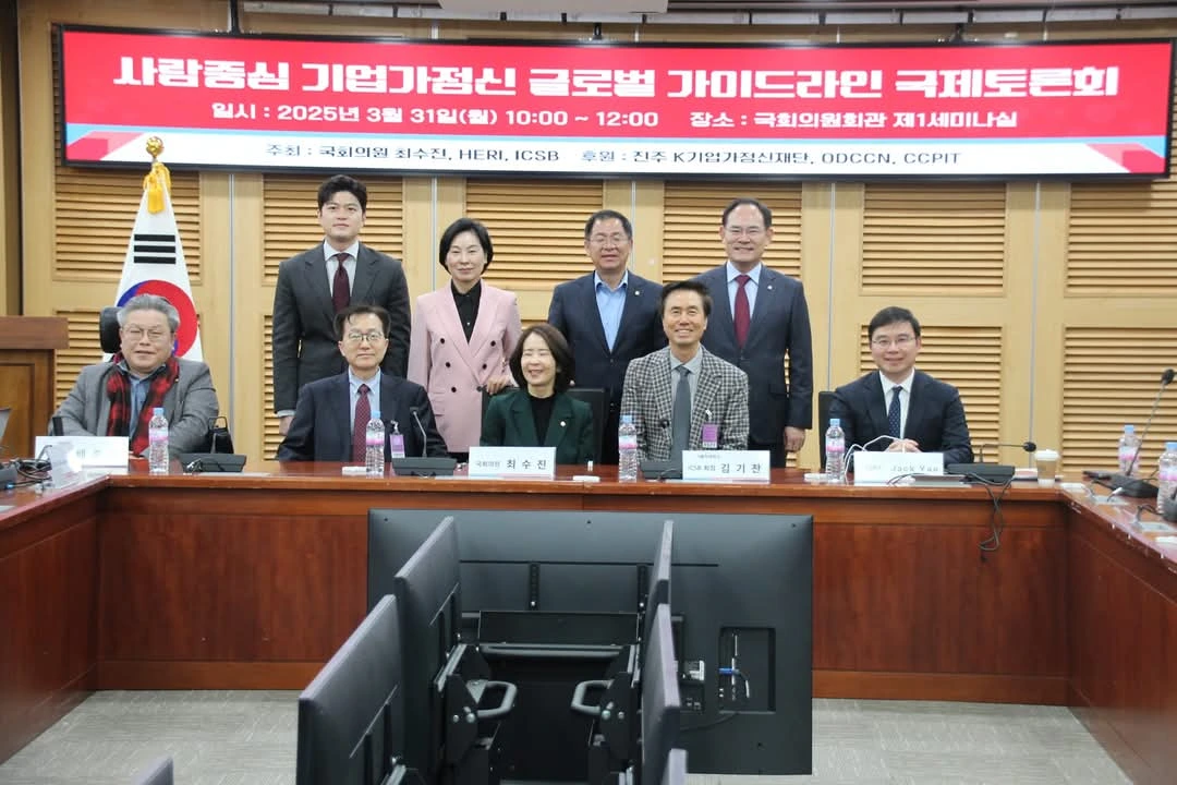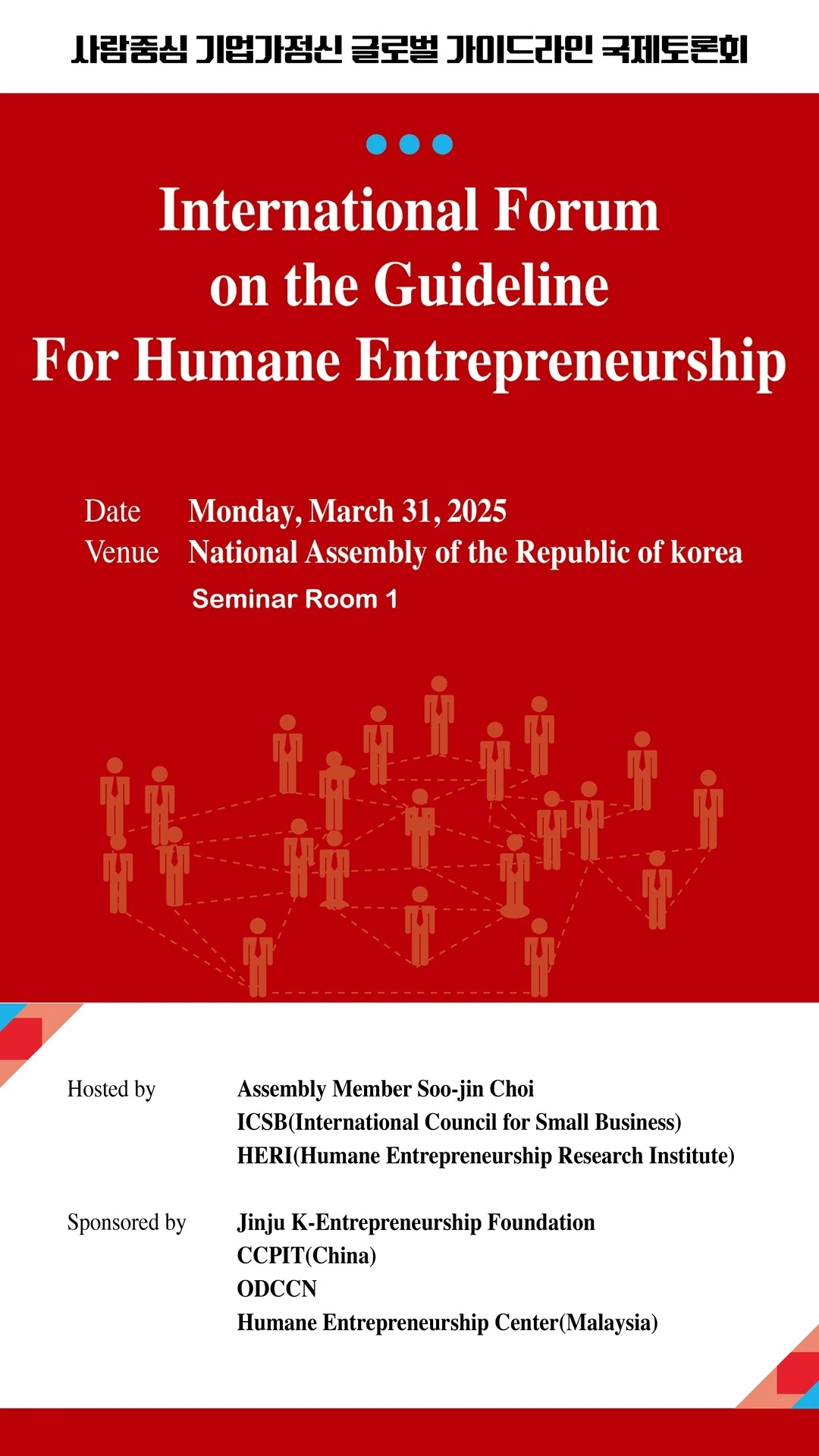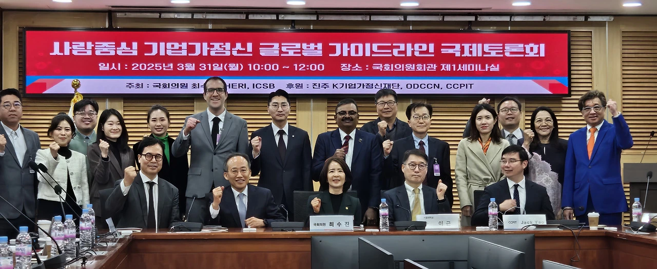 이번 토론회는 ‘사람중심 기업가정신’을 실천하고 제도화하기 위한 취지로 마련됐다. 글로벌 협력을 넘어 향후 국제표준화기구(ISO) 인증을 위한 준비 단계이기도 하다. 최수진 국민의힘 의원과 세계중소기업학회(ICSB), 사람중심기업가정신연구소(HERI)가 주최하고 중국국제무역촉진위원회(CCPIT) 등이 후원한다.