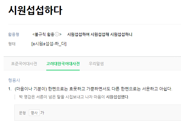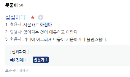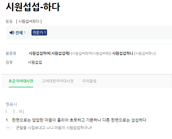 브런치에 글을 쓰기 시작한 이후, 문득 내가 쓰는 표현이 적확한지 국어사전을 자주 살펴보는데 굉장히 흥미로운 작업이다. 내친김에 '시원섭섭하다'를 국어사전에 검색해보니 다음과 같았다.