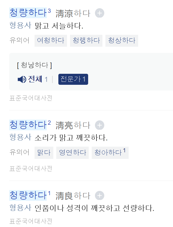 '청량하다', '개운하다' 뜻풀이와 함께