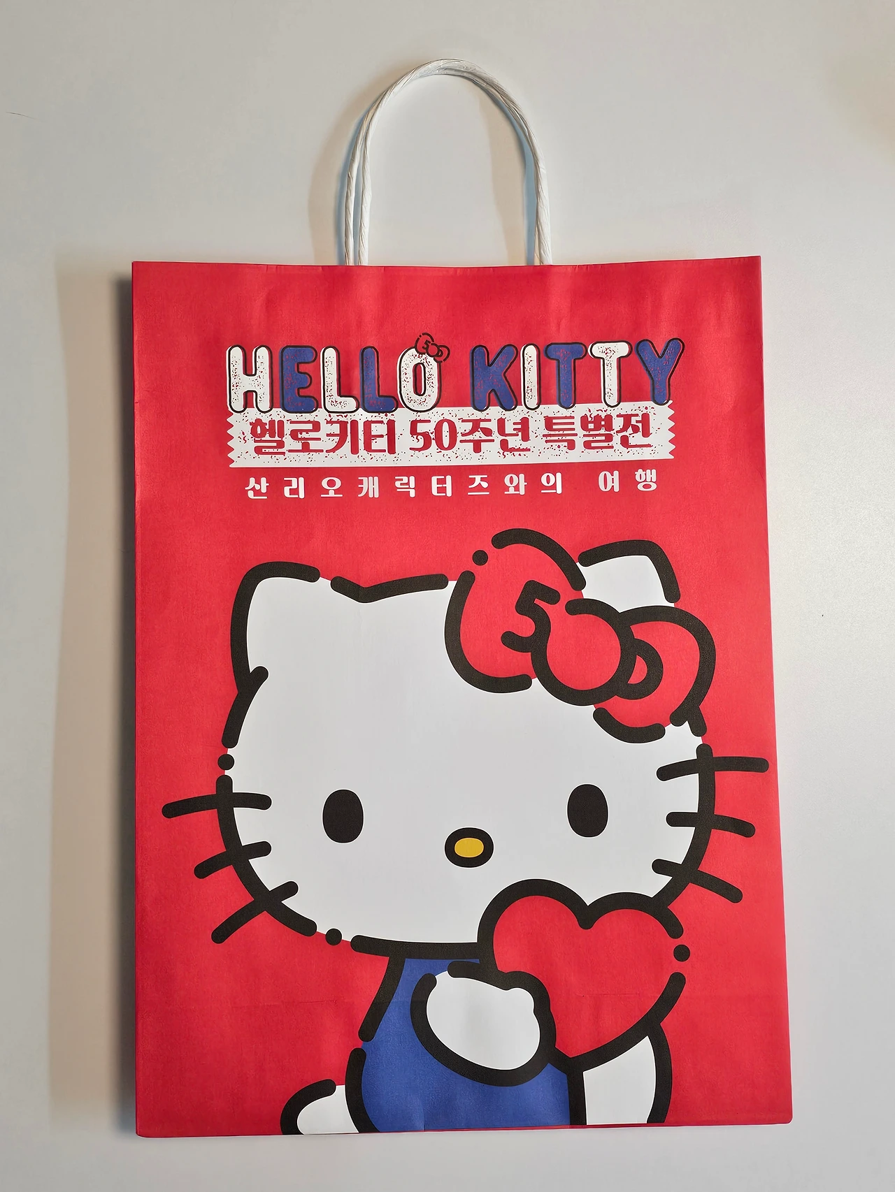 얼마 전 다녀온 헬로키티 50주년 특별전의 진정한 하이라이트 코스인 굿즈 계산대 뒤에 붙어있던 문구다. A3 정도 되는 큼지막한 사이즈, 시그니처 컬러인 쨍한 빨강 바탕을 가득 채우는 키티의 얼굴, 두께감있는 재질… 이거보다 작은 크기로 인쇄된 포스터가 만 원을 훌쩍넘는데 단돈 400원이라니, 안 살 이유가 없다. 기분 좋은 쇼핑의 완성은 아무렴 물건을 예쁘게 담아줄 쇼핑백까지 구매해야 하는 것이지! 이미 6만원을 넘긴 구매목록에 쇼핑백이 추가됐다.