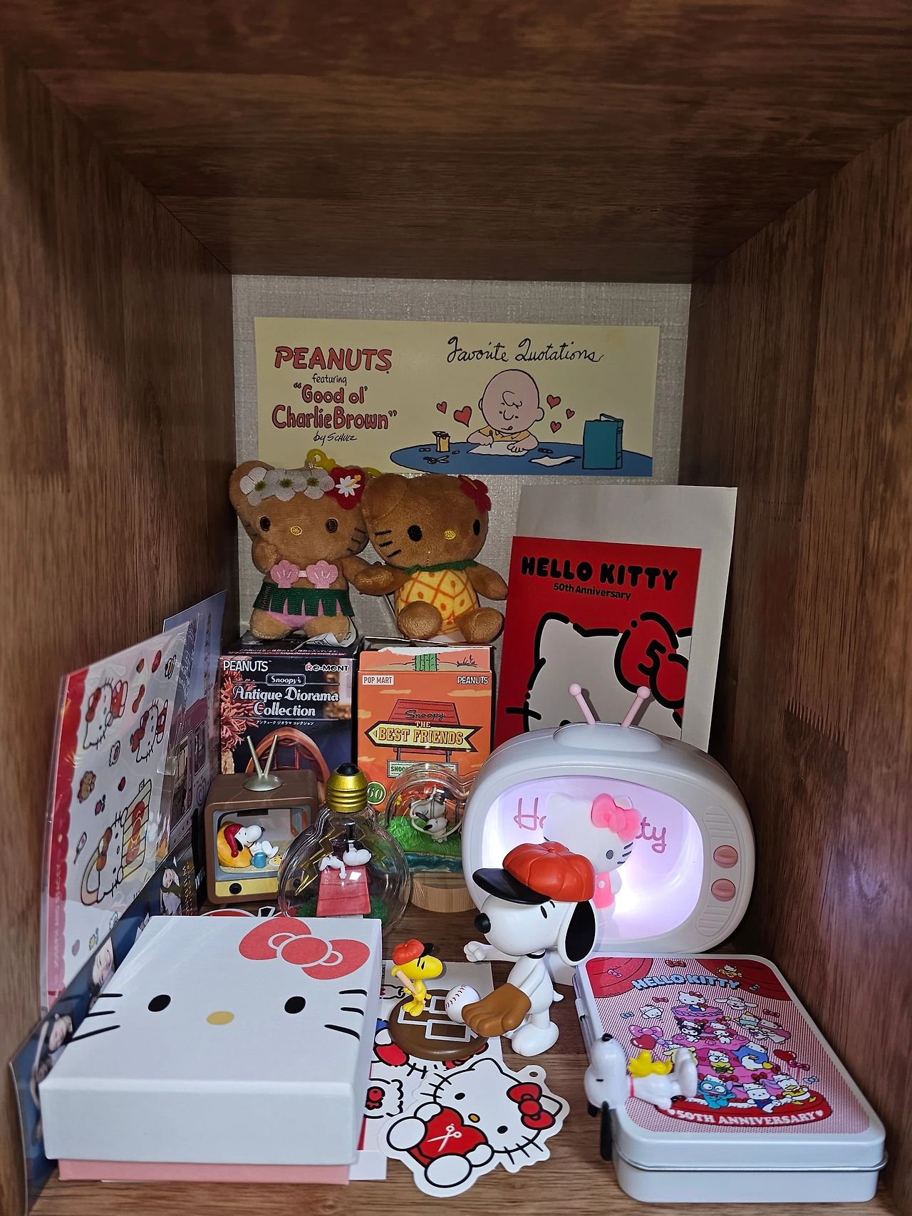 아무튼 그 대열에 나도 열심히 합류 중이다. 내 방의 책장 한 칸을 스누피와 헬로키티 굿즈들로 채웠다. 사무실 내 자리에도 스누피 달력부터 데스크매트, 피규어, 무드등, 떡메모지와 볼펜, 스티커들을 구비했다. 책이 아닌 스누피 굿즈들을 쇼핑하기 위해 알라딘 중고서점 매장에 방문하는 것이 소소한 취미가 되었고, 몇 달 전에는 헬로키티 50주년 전시회를 다녀오며 각종 굿즈들을 담아왔다.