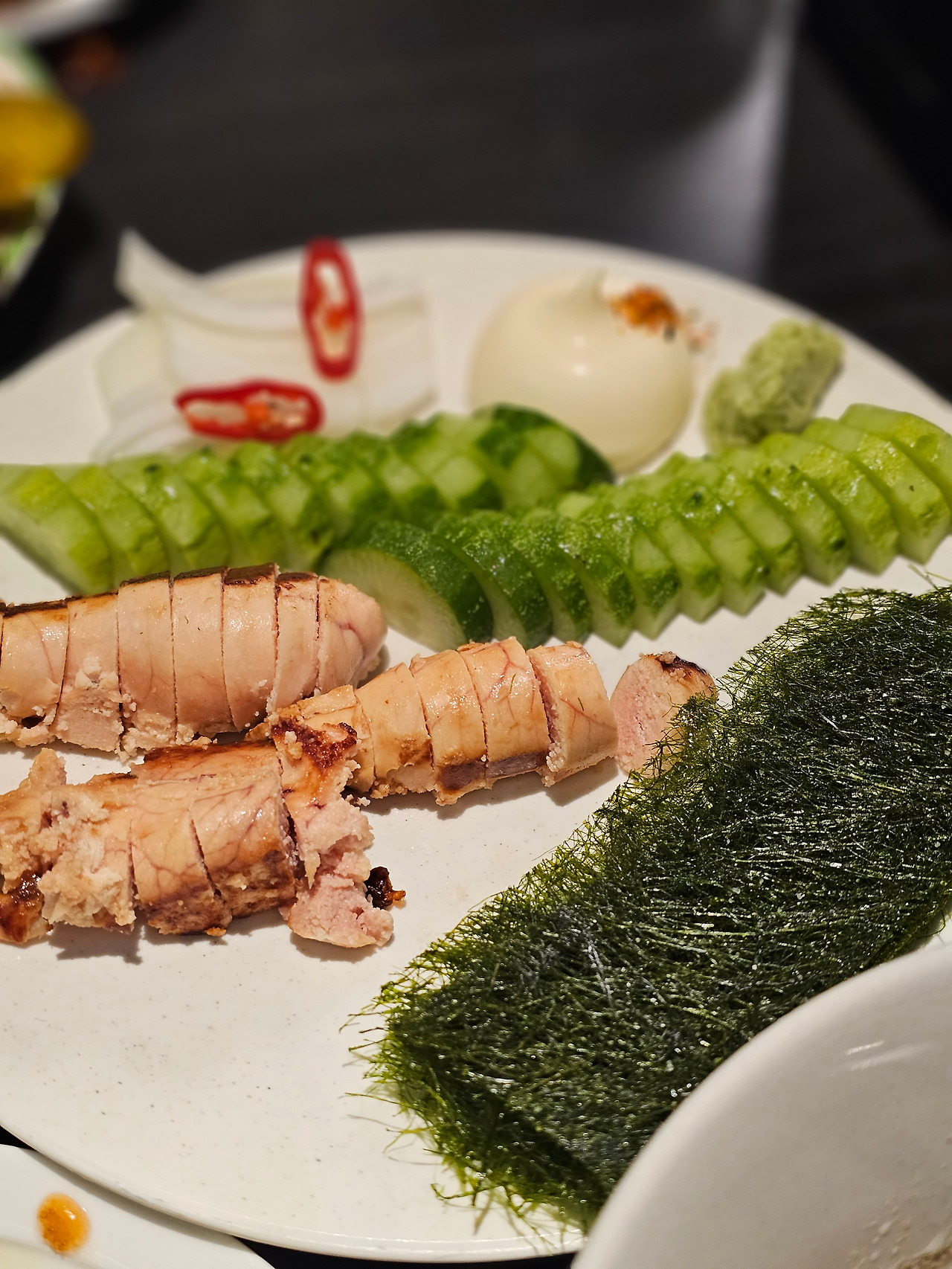 버터에 맛있게 구워진 저염 명란과 오이, 감태, 마요네즈와 생와사비가 한 접시에 나오는데 이 모든 것들을 한 입에 넣으면 그 조화로움이 이루 말할 수 없다. 오이가 명란의 짜고 텁텁할 수 있는 맛을 산뜻하게 잡아 주고 마요네즈는 고소함과 부드러움을 더해 준다. 와사비로 느끼함을 한 번 더 잡아 주고 감태는 식감의 재미를 살려 준다.