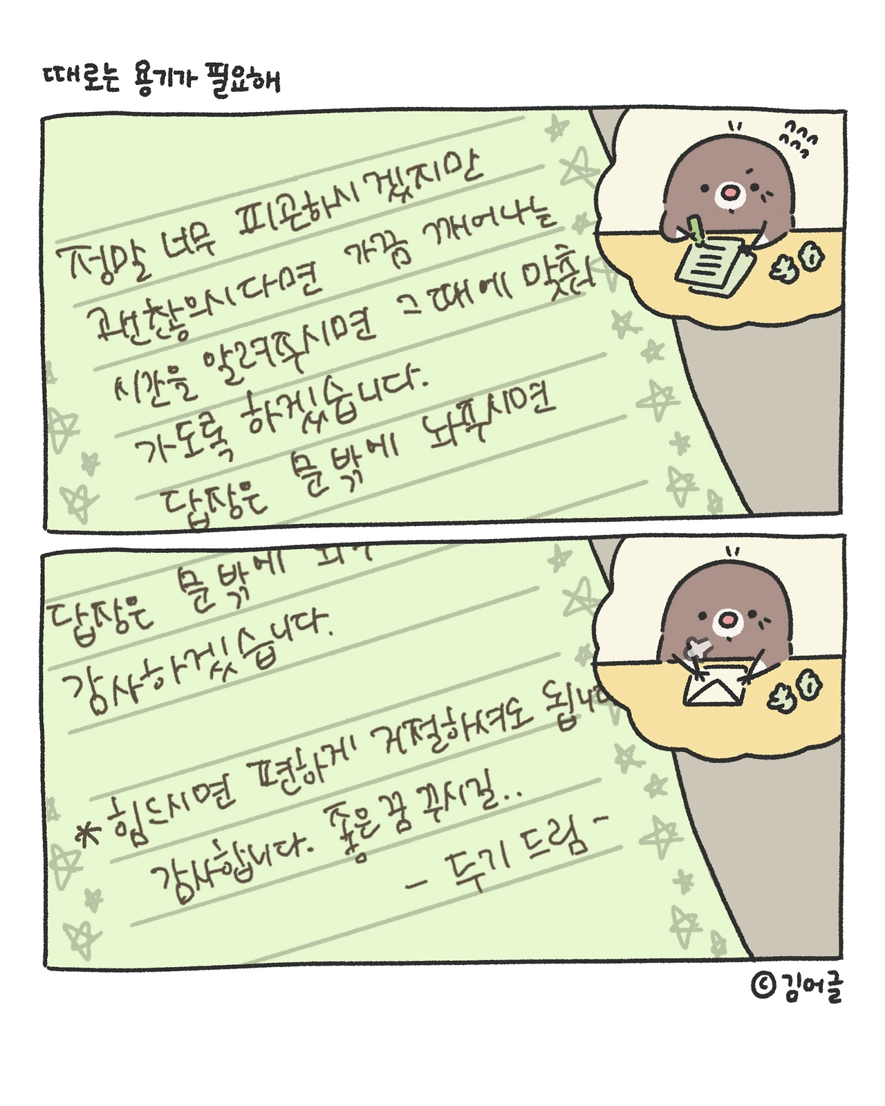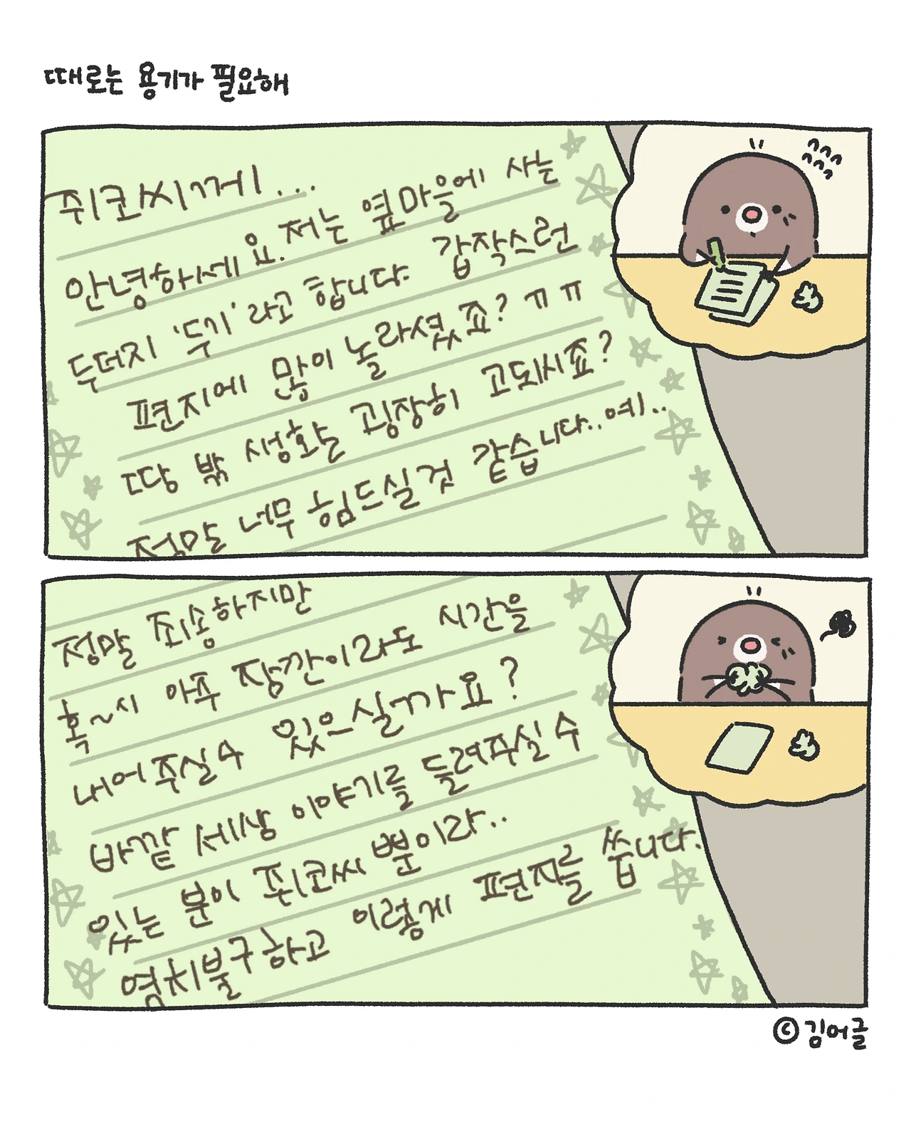 안녕하세요. 저는 옆마을에 사는 두더지 '두기'라고 합니다. 갑작스런 편지에 많이 놀라셨죠? ㅠㅠ