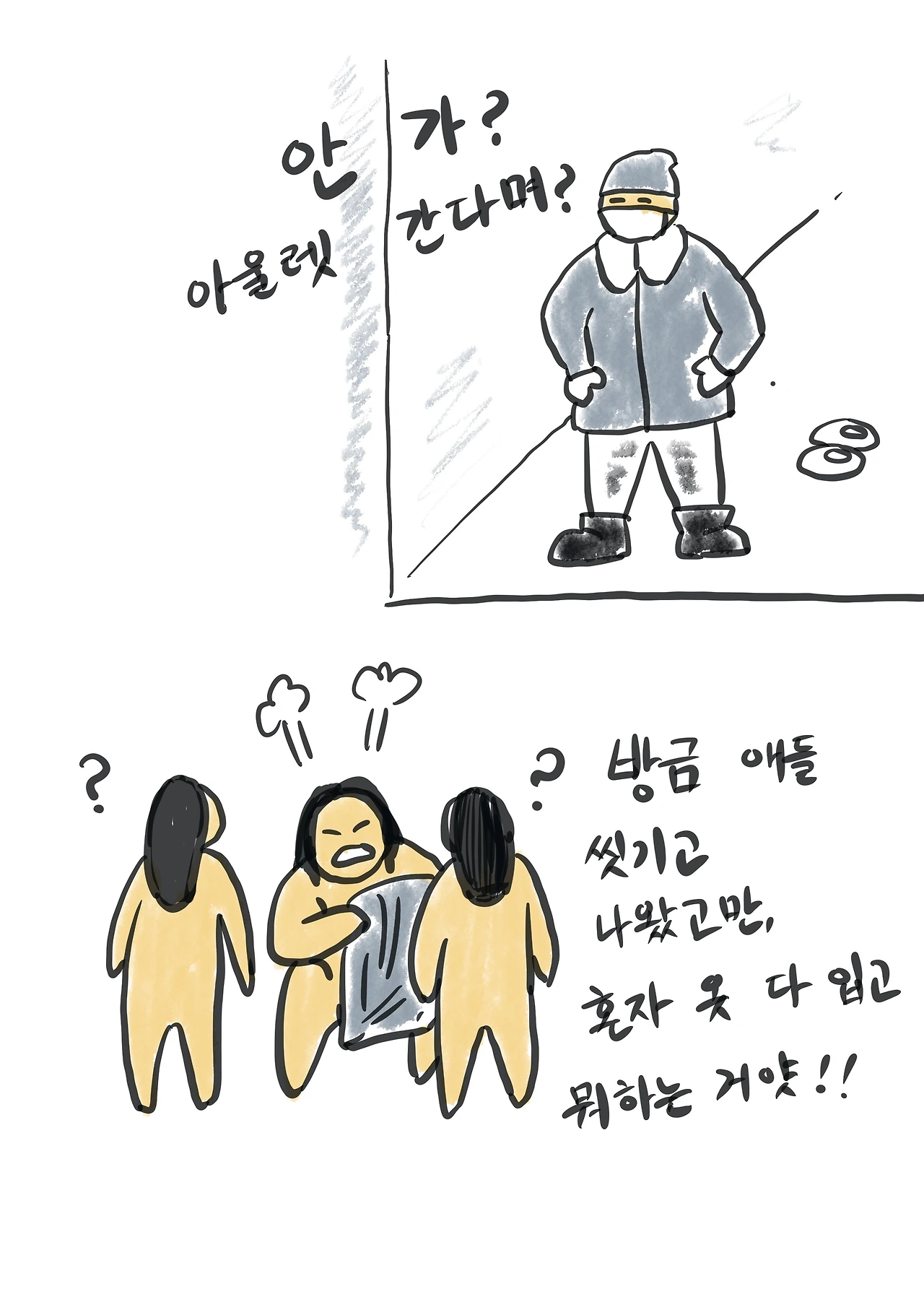 왜 다 차려입고 현관에 서 있어? 사람 불안하게!”