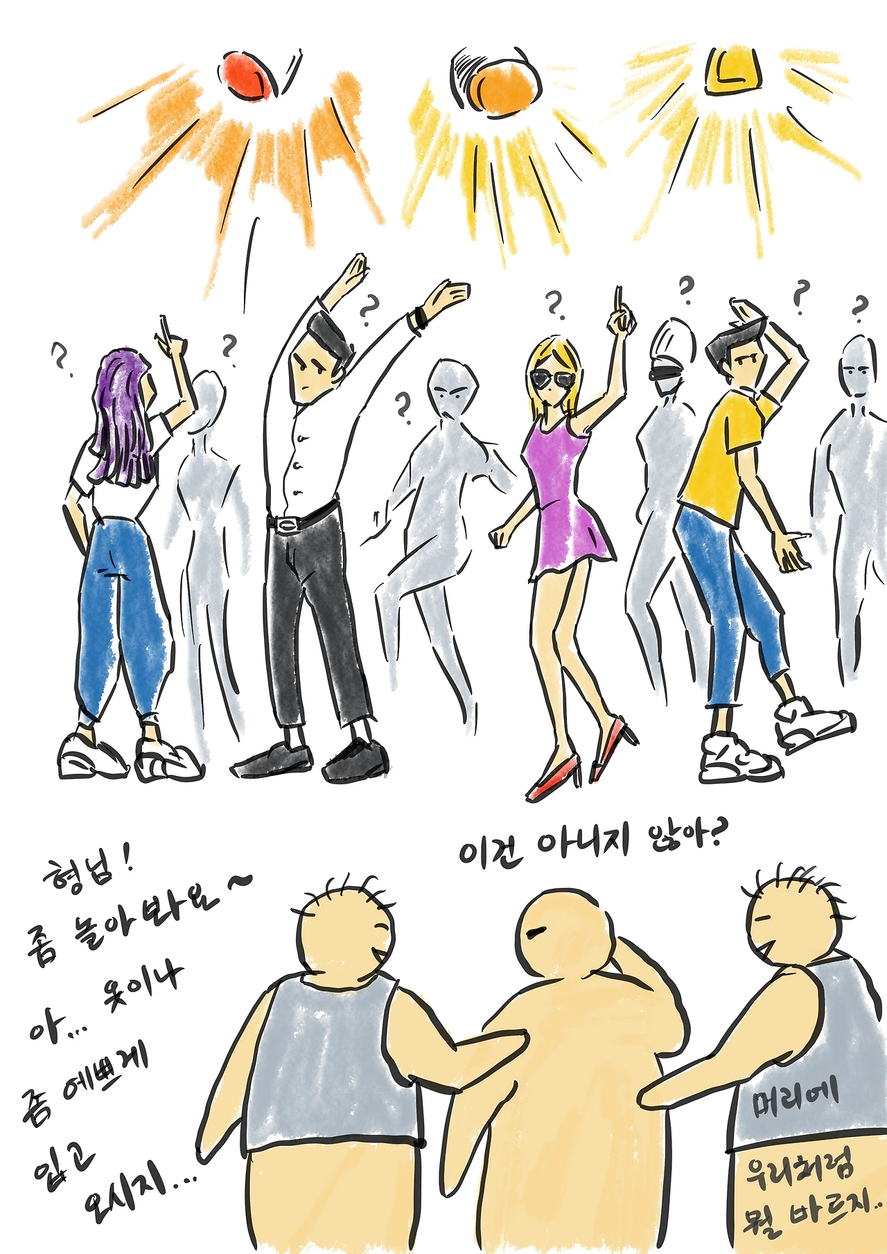 시끄러운 음악, 젊은이들의 흐느적거림,