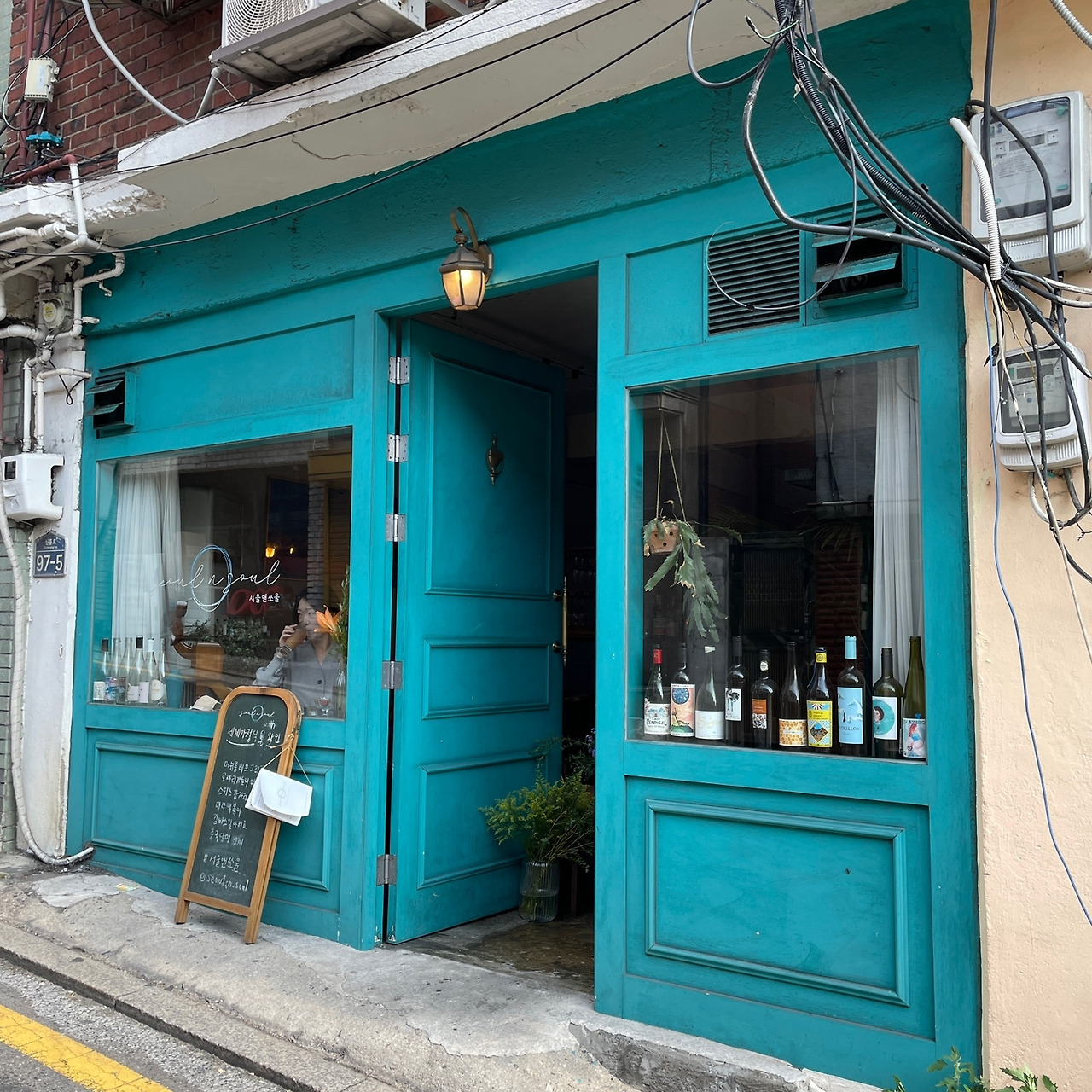 그리고 '서울 앤 쏘울'에 도착했다. 지중해 느낌의 청록색 페인트가 마음에 들었다. 내부에서 흘러나오는 음악, 테이블마다 생화가 꽂힌 화병, 식기류, 밖에서 들어오는 자연광, 주모가 쉼 없이 테이블을 살피며 요리를 하는 오픈 키친의 조화가 '오늘 여기 오길 정말 잘했다. 혼세님 정말 최고다. 오늘 약속 잡기를 정말 잘했다.'라는 생각이 들게 했다. 버스에서 읽던『책과 우연들(김초엽)』을 꺼내 이어 읽으려 했지만, 이 순간을 담기 위해 인스타 스토리 업로드만 했다.