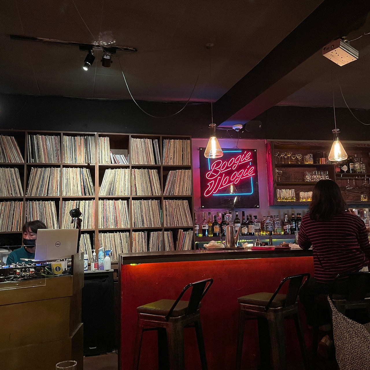 J형 인간이자 카카오맵 신봉자인 나는 다시 카카오맵 평점 4.5 이상의 근처 바를 검색했고 '록시'를 찾았다. 꽤 오래 걸었는데 해방촌이 아닌 경리단길에 속한 곳이었다. 가는 길에 횡단보도에서 엄청 큰 악기와 함께 서있는 외국인을 보았는데, 이게 복선이었다. 지하에 있는 바의 어두운 분위기와는 다르게 칵테일은 상큼했다. 음악이 좋긴 했지만 음악 소리가 대화를 방해할 정도로 커서 오래 머무르기는 힘들었다. 요즘 카맵 평점에 대한 신뢰가 조금씩 내려간다 (물론 네이버보다는 10배 이상 신뢰함). 오늘 투어의 마지막 장소로 다른 곳을 물색했다. 좋은 장소를 찾는 역할은 친구에게로 넘어갔다. 마찬가지로 J형인 그녀도 근처에 좋은 '재즈바'가 있는 것 같다며 평을 찾아보고 문자로 방문이 가능한지를 물었다. 가능하다는 답장을 받은 우리는 '부기우기'라는 바로 향했다.