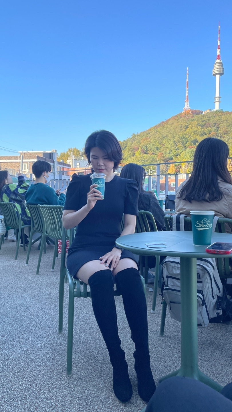 다음으로 근처의 '쉘터 서울'을 갔다. 남산타워를 배경으로 전신샷을 찍을 수 있는 카페로 뷰가 좋다고 하여 저장해 둔 곳이었다. 프릳츠 커피를 제공하는 것도 마음에 들었다. 테라스 자리가 나기를 기다리다가 얼른 하나를 차지하고 다시 이야기를 이어갔다. 물론 사진 마음에 들 때까지 찍어주기를 포함하여.