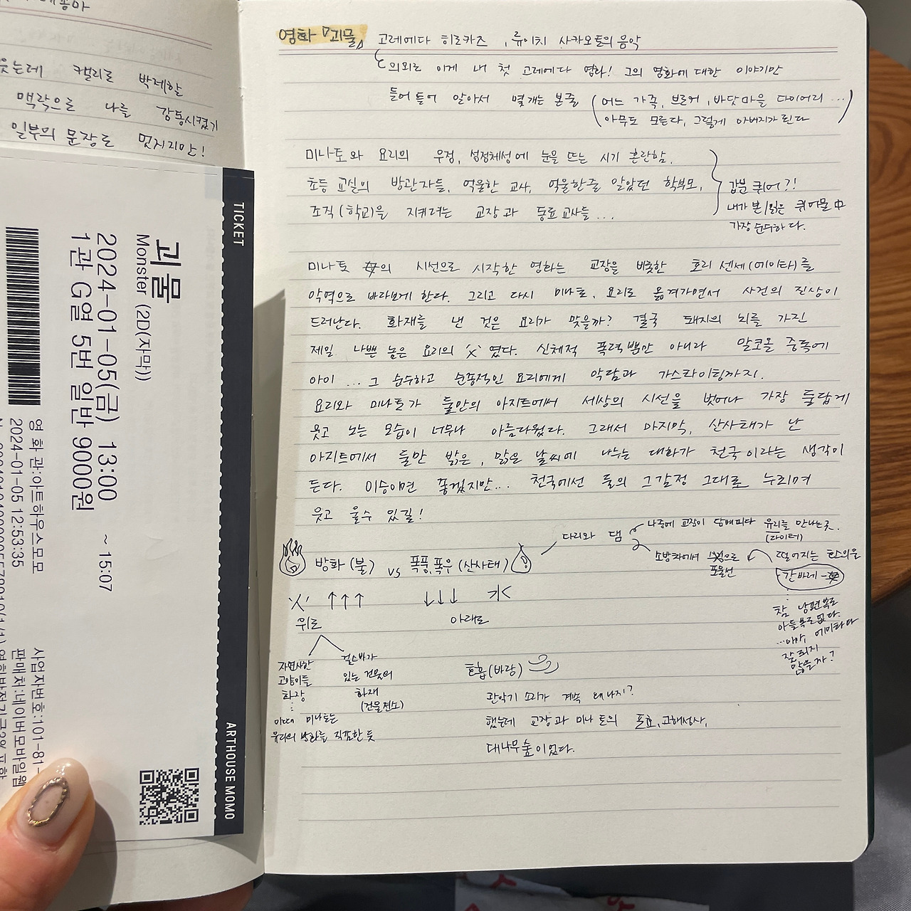 방학 첫날이 금요일인 것은 한적하게 즐길 수 있는 것들을 부지런히 즐기라는 계시다. 주말 아침에 종종 방문했던 아트하우스모모에서 영화를 봤다. 무진장 보고 싶은 영화가 있었다기보다는 너무 상업적이지 않은 다양한 영화를 볼 수 있는 모모가 좋기 때문이다. 시간이 맞는 영화는 고레에다 히로카즈 감독의 ‘괴물’이었다. 지하철 광고로 개봉 소식은 알고 있었고, 스토리는 전혀 몰랐지만 워낙 유명한 감독이니 잘 만들었을 것이라 생각했다. 영화가 시작하지 얼마 안 되어 아주 살짝 후회했다. 학교 이야기였기 때문이다. 직장 이야기를 영화에서까지 보고 싶은 마음은 없었지만 어쩌다 관람은 시작되어 버렸다.