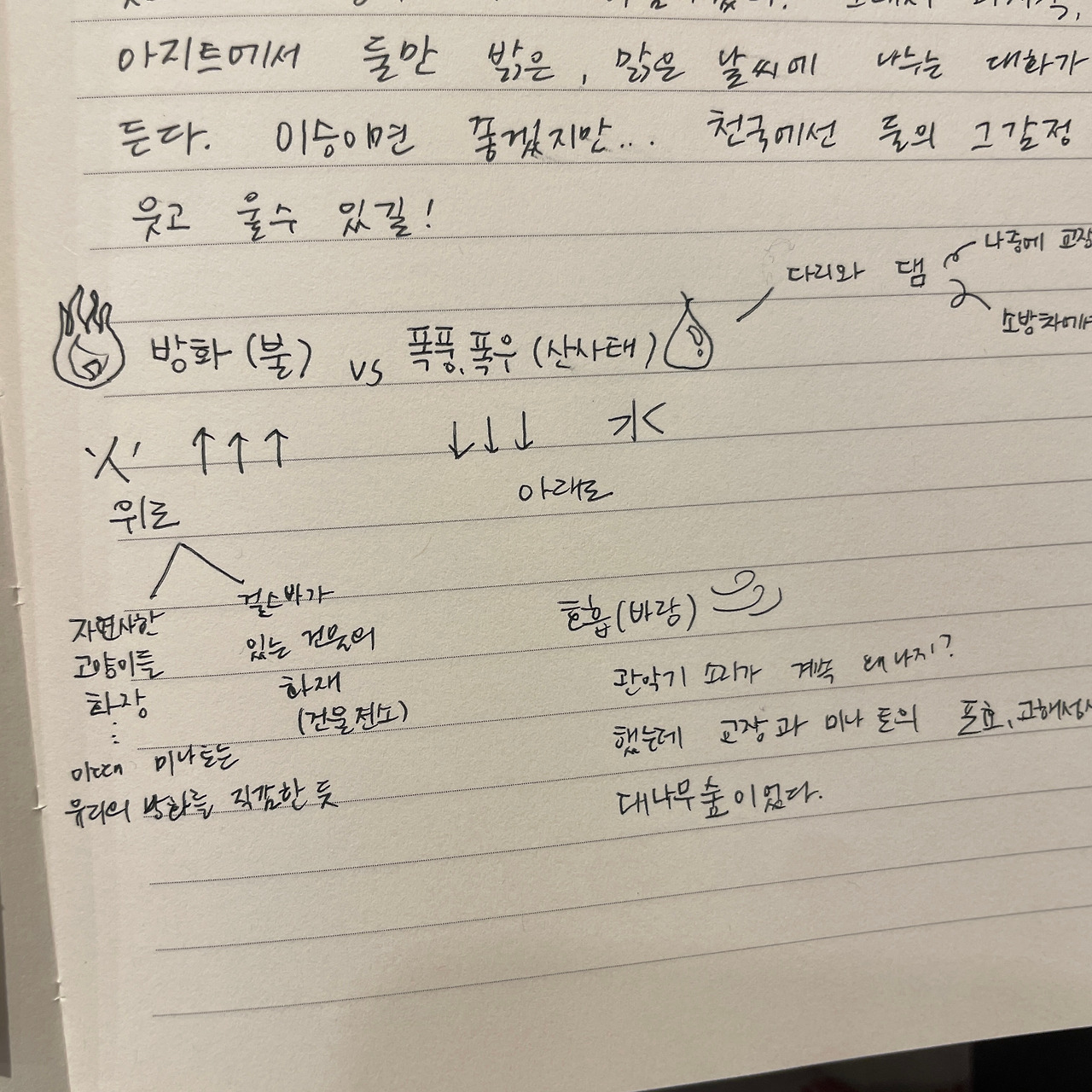 영화에는 화재(불)와 수재(태풍과 폭풍우, 산사태)가 대비되며 클로즈업된다. 불과 물은 양날의 검과 같이 유용하지만 과하면 인간에 해가 되는 존재이다. 내 얕은 지식과 추론으로는 불은 화(anger)의 폭발, 걷잡을 수 없이 퍼져나가는 유언비어의 전파(spread), 인스타 라방을 가능케 하는 전파(electric wave)를 상징한다. 그리고 물은 위에서 아래로 무겁게 이러한 불을 짓누르는 힘이다. 미나토와 요리를 구원하는 게 물이었다. 요리가 방화한 것으로 추정되는 화재를 진압한 것은 소방관이 든 호스에서 나온 물줄기였고, 감당하기 어려운 미나토 마음속의 화염을 누른 것은 산사태까지 유발할 정도의 폭풍우였다.