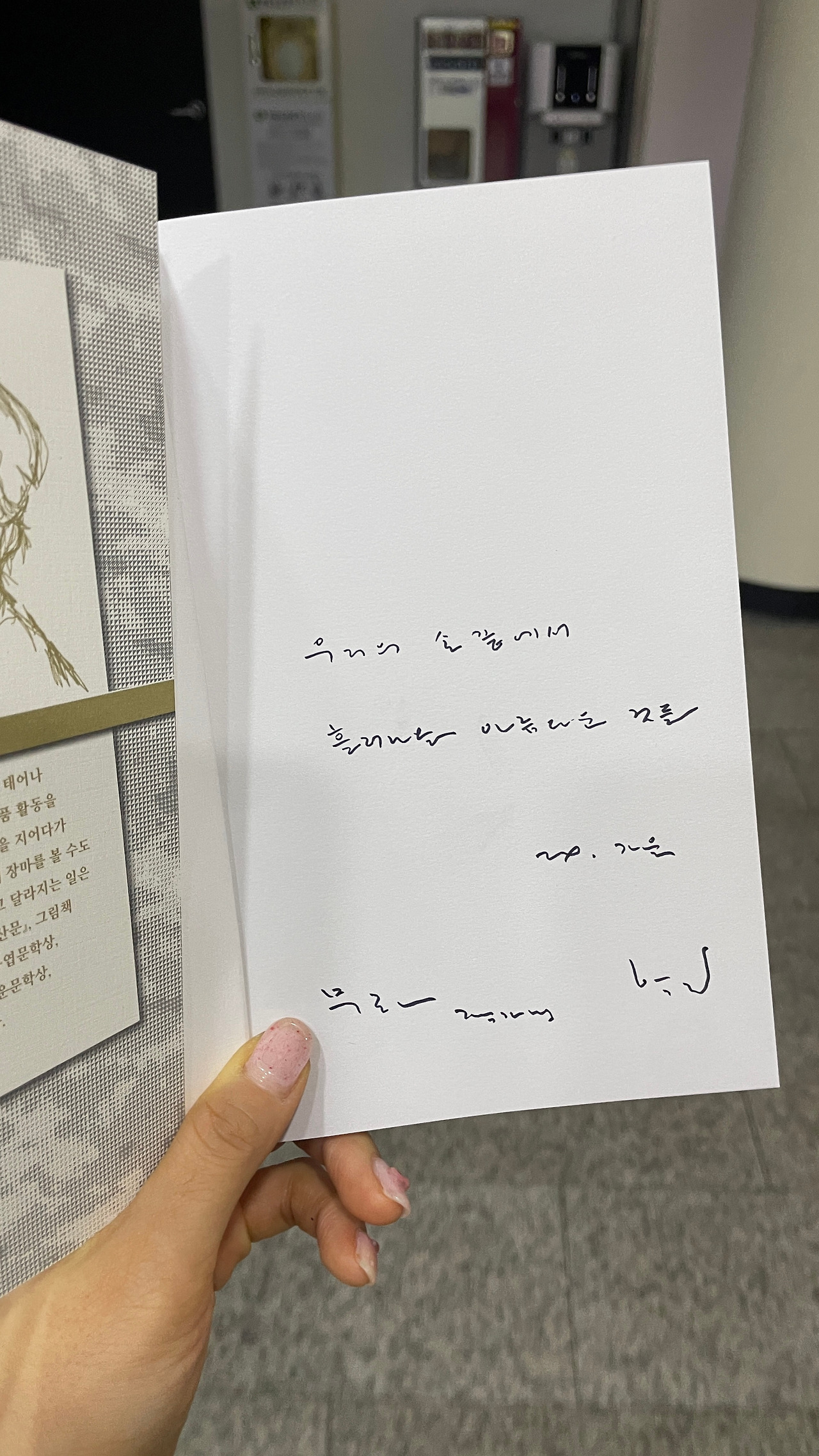 시인은 다양한 매체에 얼굴을 비추고 있었으며 출판사 문학팀 편집자라는 본업도 있었다. 전업 작가인 줄로만 알았는데 본업이 있는 작가라는 점에서 내적 친밀감이 높아졌다. 약간의 시기심과 함께. 이제부터는 시쌤이라고 하겠다. 나의 시 선생님이기도 하고, 시샘을 불러 일으키는 존재니까. 시쌤은 본인에게 시를 쓰는 일은 취미에 가까우며 매일 20분만을할애한다고 했다. 그럼에도 ‘직업’과 ‘노동’의 정의를 들여다보며 본인이 ‘시인’이 맞다고 주장했다. 시를 쓸 때마다 인상을 찌푸리게 되지만 그것은 본인이 좋아서 선택한 행위이며, 들인 시간과 노력에 비해 금전적 대가가 높지는 않지만 그럼에도 본인의 직업은 시인이 맞다고 했다. 수필집 ‘밥벌이의 지겨움(김훈)’에 나오는 문장을 인용했다.