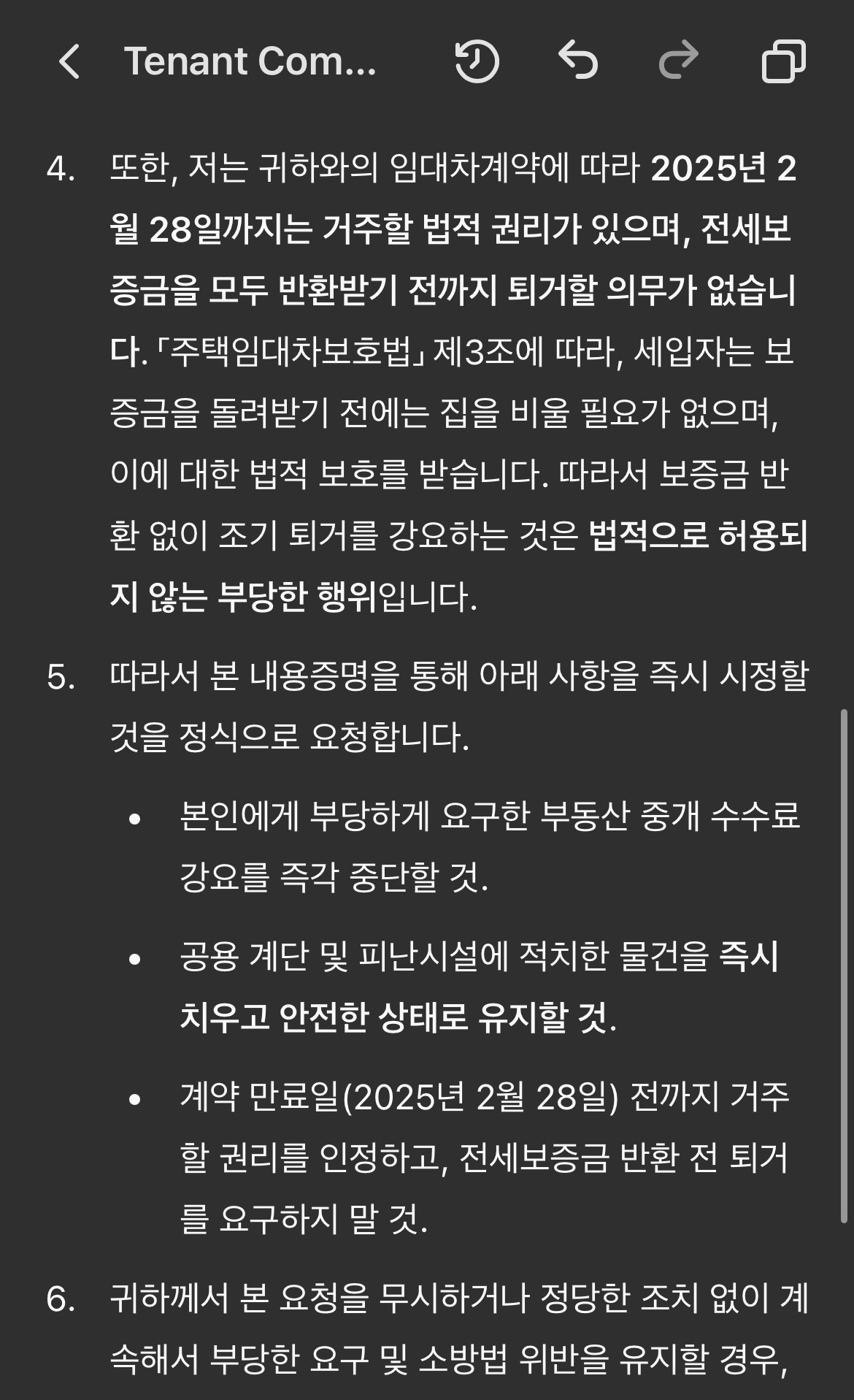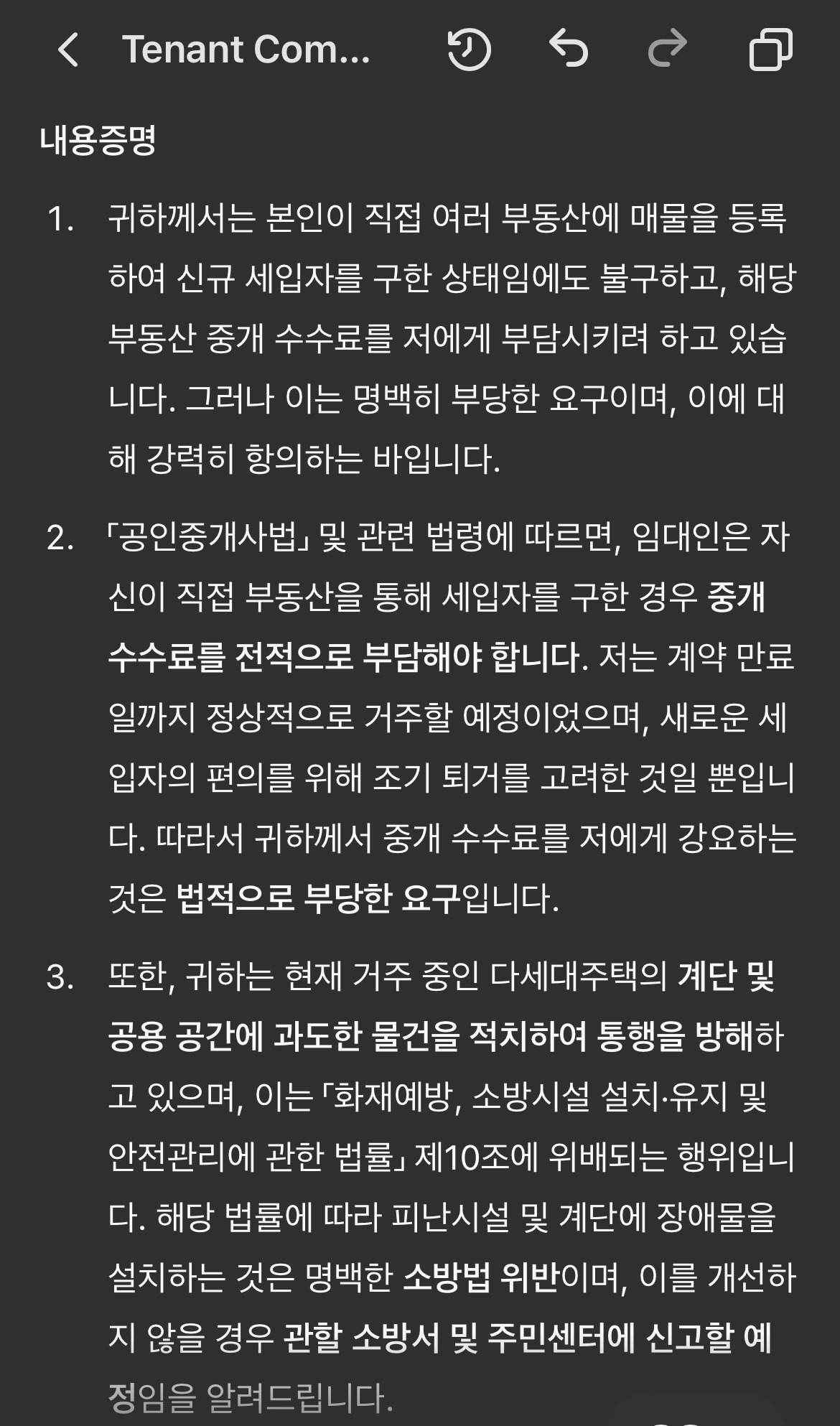 이 내용도 챗에게 물으니 근거를 들어맞다는 것을 확인시켜 주었고, 이 내용도 포함하여 내용증명 서류를 보완하였다.