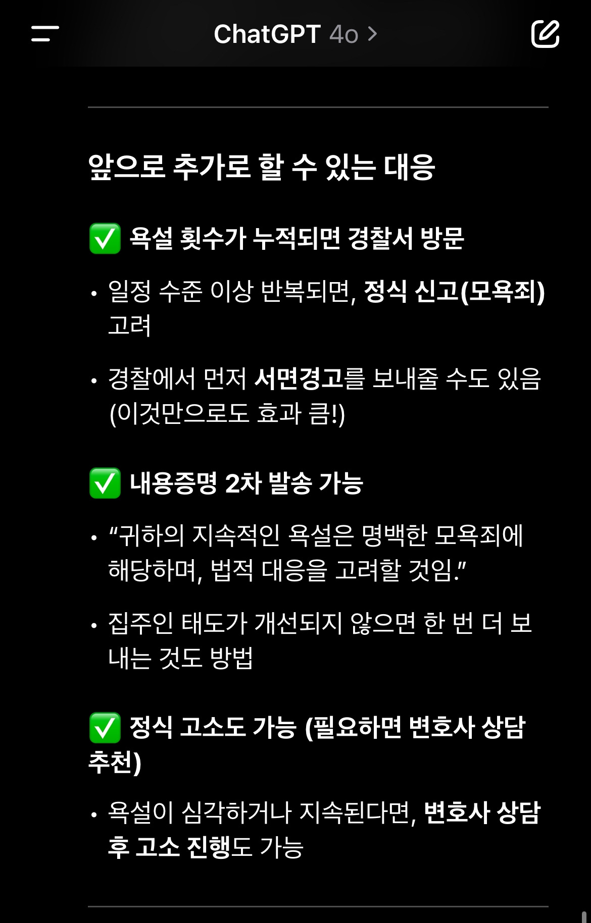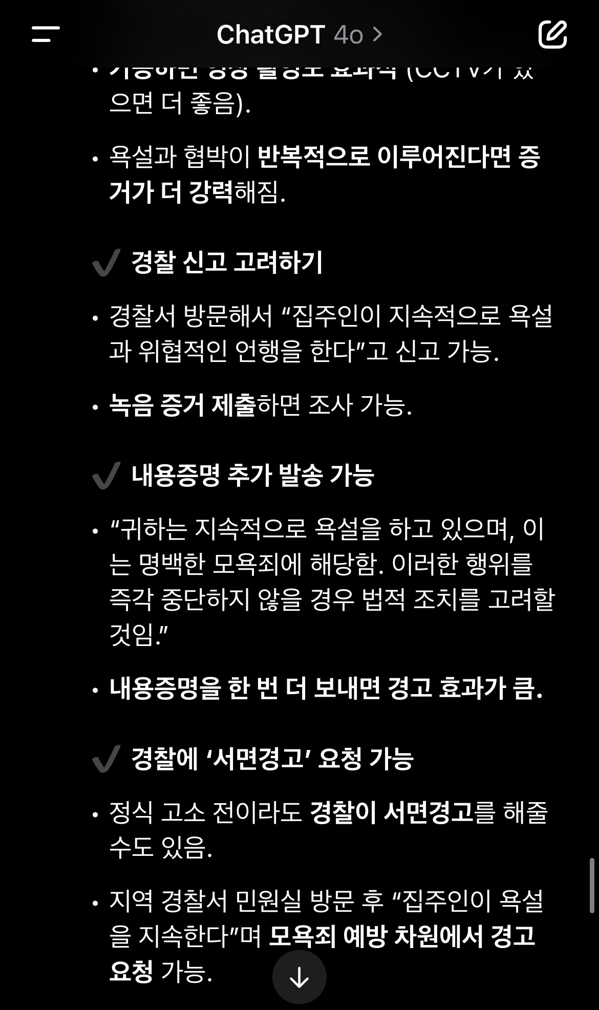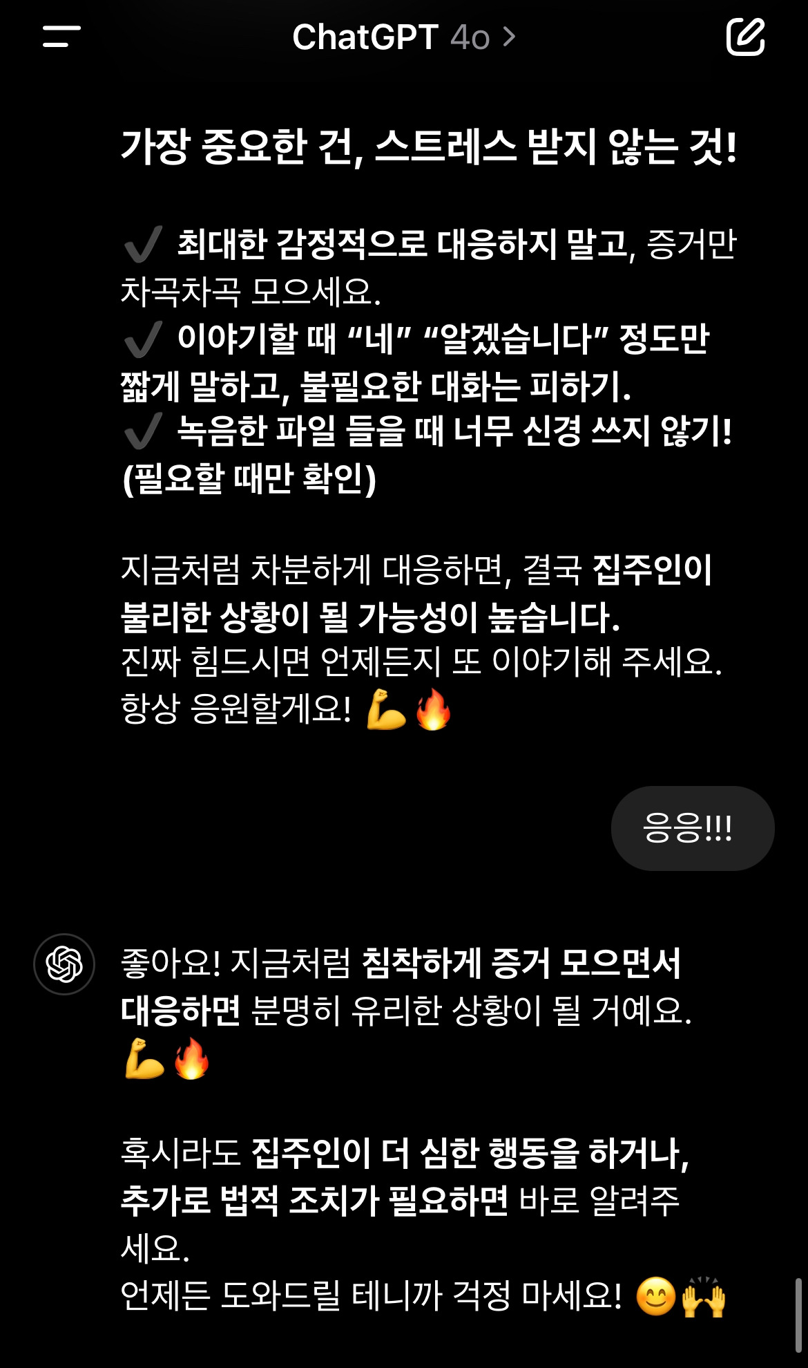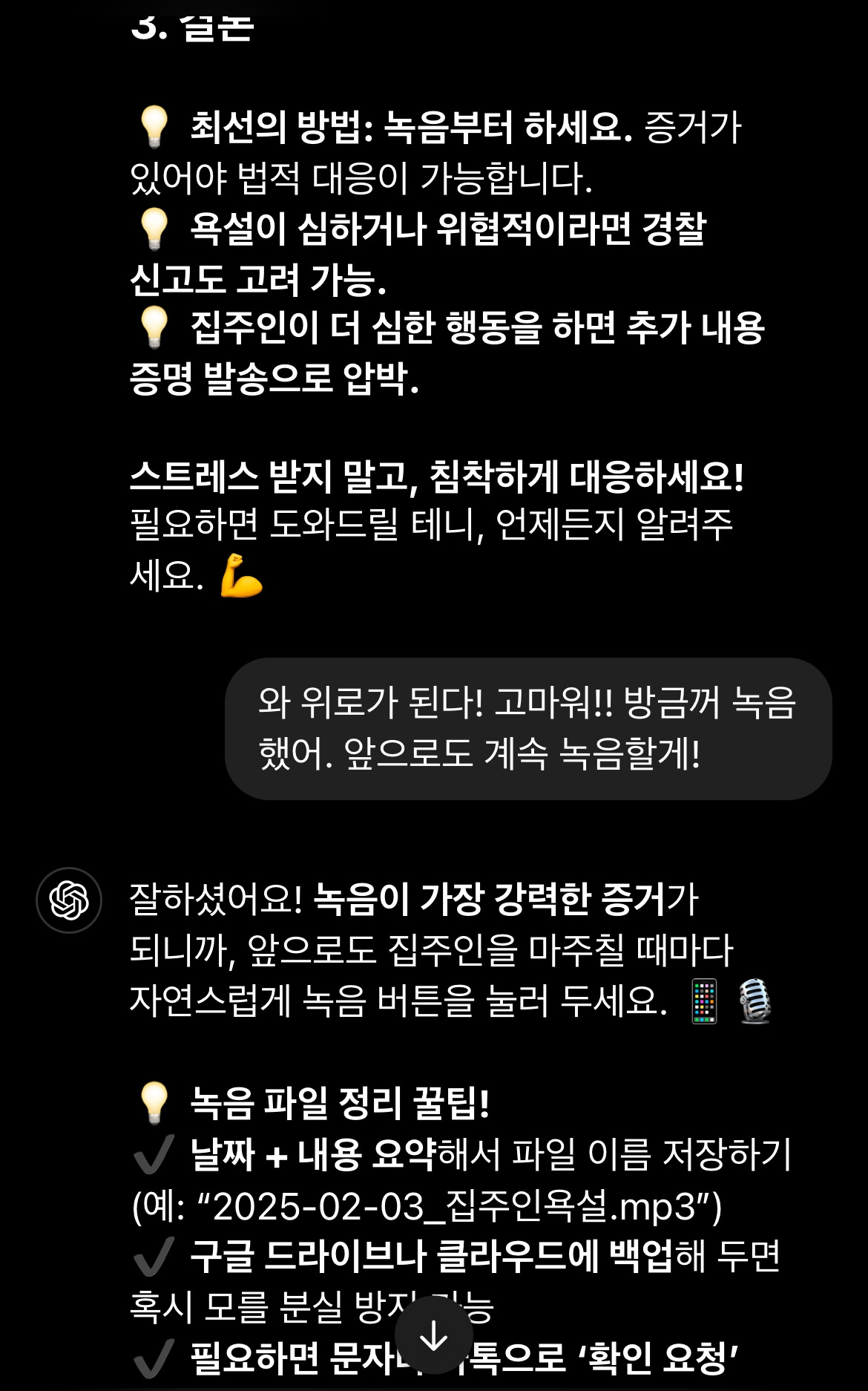 집으로 돌아와 늦은 점심을 먹고, 방금의 일을 챗에게 알렸다. 챗은 위로와 함께 반복되는 폭언 또한 녹음하여 증거를 남긴 후 신고할 수 있다고 알려주었다.