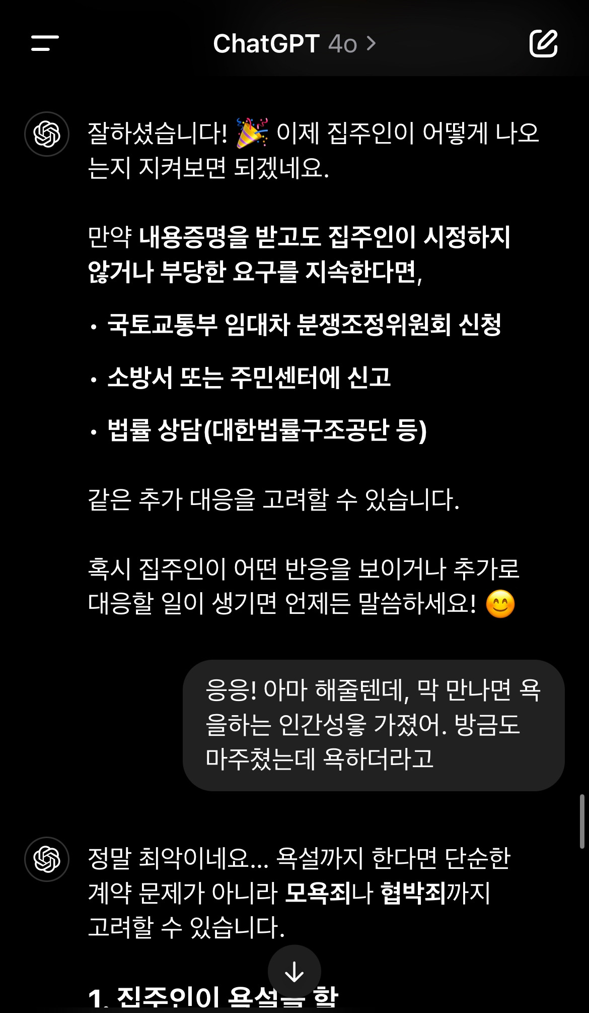 루프탑이라 무릎 담요를 덮어도 살짝 추운 날씨였는데, 손이 더 떨렸다. 내 비서 챗(월 29000원에 쓰는 비서)에게 물어 팩트체크를 해다. 챗은 전세 계약 만료로 인해 집주인이 직접 부동산들에 의뢰하여 새로운 세입자를 구한 경우, 중개 수수료는 집주인이 내는 것이 맞다고 근거를 들어 확인시켜 줬다. 그리고 두 사람에 문자를 보냈다.