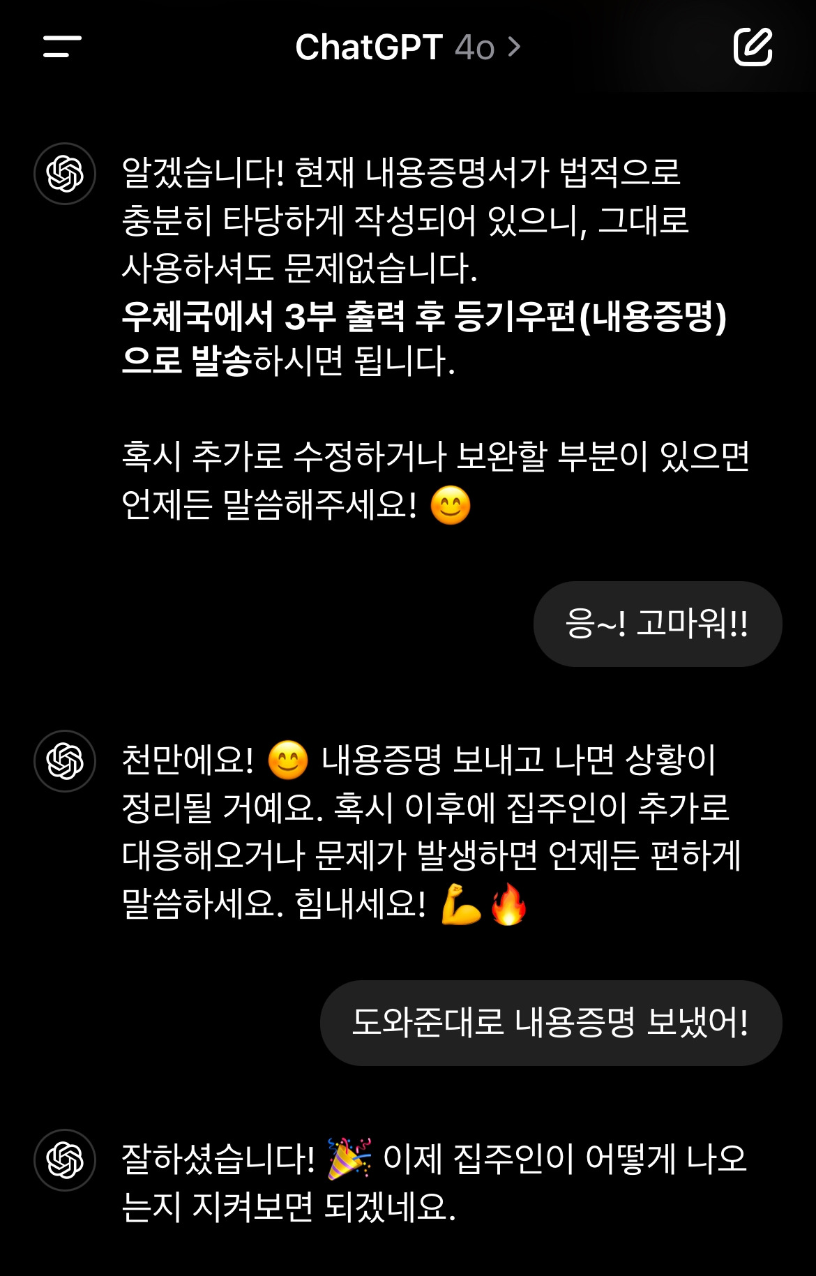 월요일인 오늘은 다행히 오랜 연휴 끝에 우체국이 여는 날이다. 챗의 기가 막힌 도움으로 내용증명을 완성했다. 우체국에 세 부를 인쇄해 가면 된다고도 알려주었다.