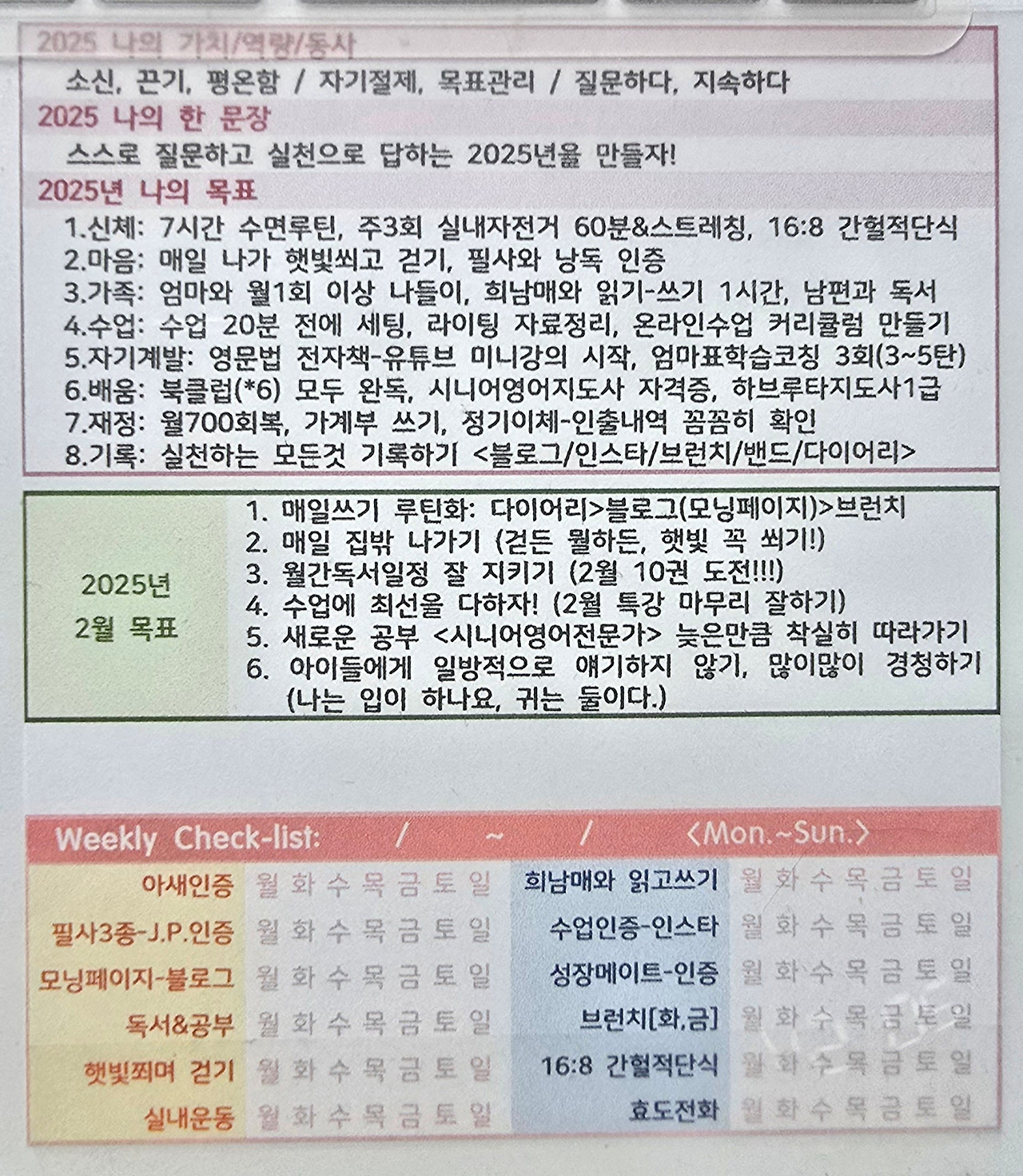 이렇게 올해의 규칙을 정하고 <성장메이트 2025>가 시작되었다. 1년간 목표관리와 자기 성찰을 통해 실질적인 성장을 이루어내는 과정을 함께하는 프로젝트다. 책도 한 권 함께 읽고 생각을 나누며 매일매일 세 가지의 감사거리를 인증하기도 한다. 그리고 한 달의 마지막은 그 달의 목표와 실행, 나의 성장과 아쉬운 점을 꼽아보며 함께 이야기 나누는 시간을 갖는다. 2025년의 목표와 실행에 대해 1월 첫 주에 함께 이야기 나누었고, 나는 그 목표와 체크리스트를 노트북 빈 곳에 출력하여 붙여두고 매일매일 들여다보며 나의 마음을 다잡았다. "그래, 나는 기록하는 한 해를 보내기로 했지. 기록하자. 뭐든 기록하고 잠들자."