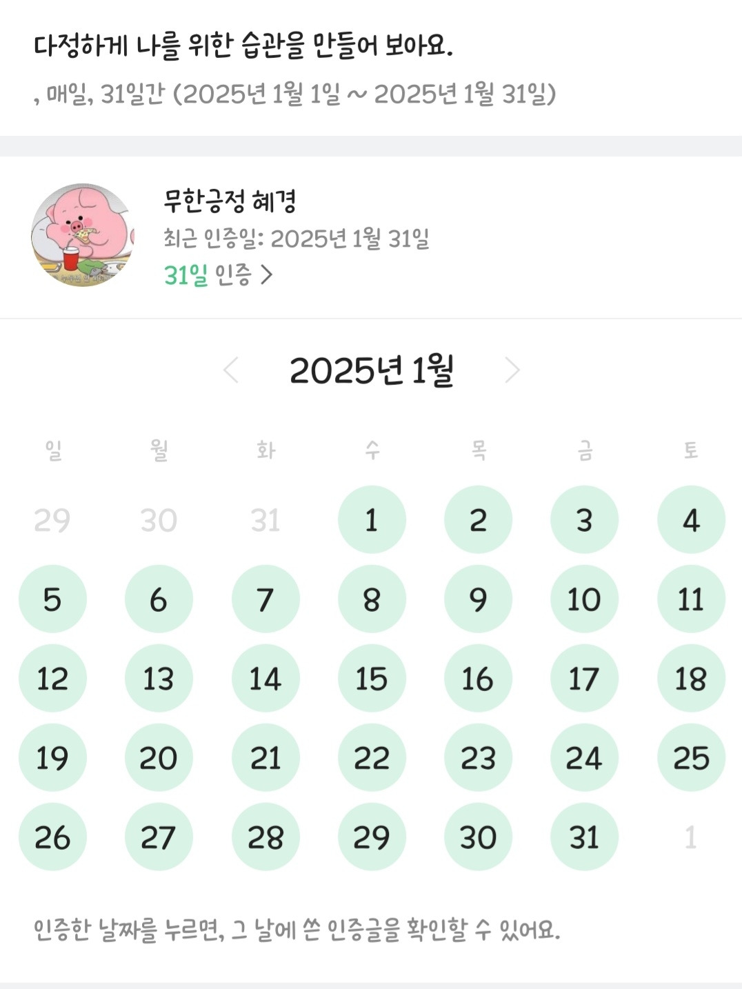 일단, 밴드에 매일 감사일기를 적었고, 그 기록이 고스란히 남았다. 가끔 밴드에서 '내 (인증) 현황'을 들여다보면 인증의 증거인 초록 동그라미가 나를 그렇게 뿌듯하게 할 줄이야. 1년 동안 하루도 빠지지 않고 나의 매일에 초록 동그라미를 표시해 주기로 결심하기도 했다.
