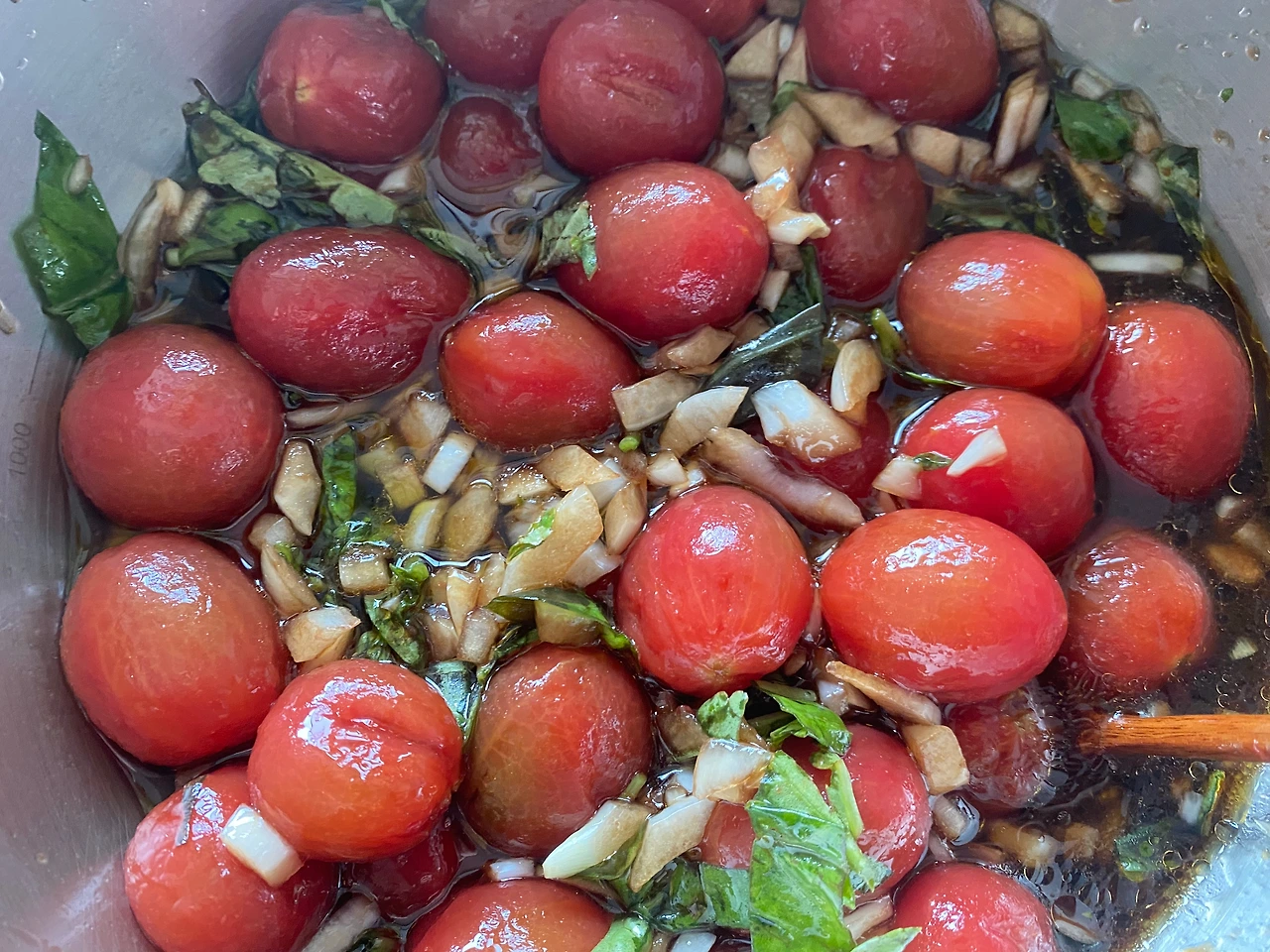 오늘은 빨갛게 익은 방울토마토와 향기가 뛰어난 바질을 수확했으니까 토마토 마리네이드 당첨이다.