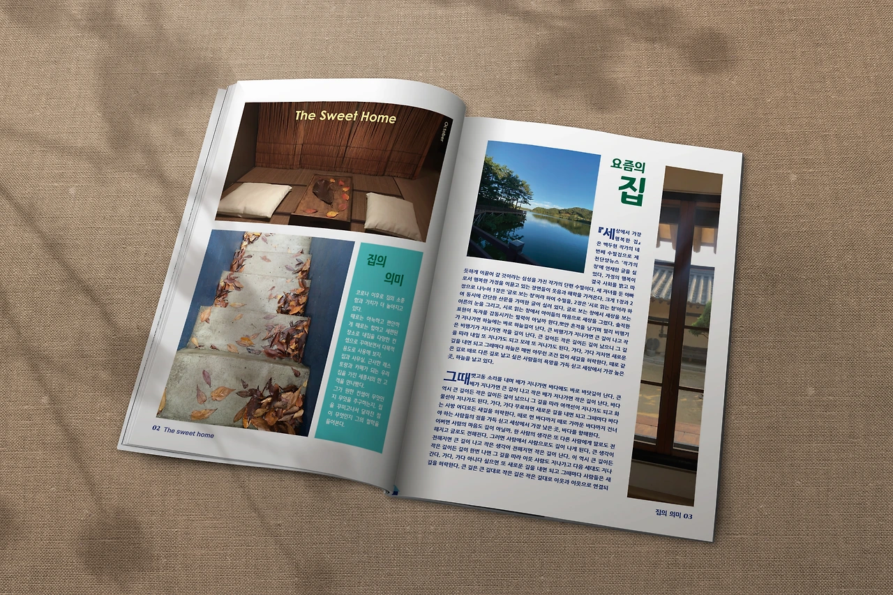 아래 사진은 디자인 학원 다닐때 제가 직접 찍은 사진들로 만든 “우리집 소개 잡지”입니다.