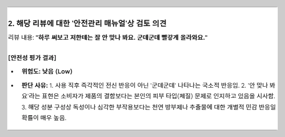 안전관리 매뉴얼 상 검토 의견으로는 위험도는 낮으나, 천연방부제나 추출물에 대한 개별적인 민감 반응으로 본다는 평가까지 주고 있습니다.