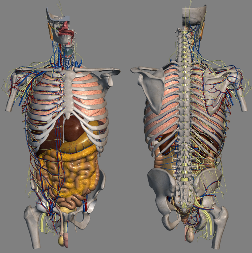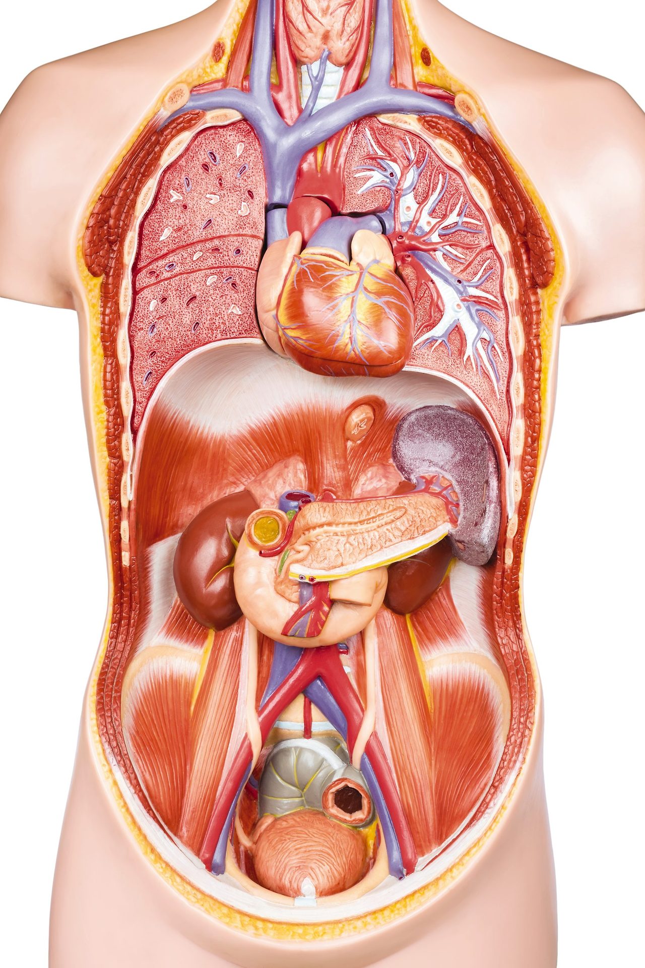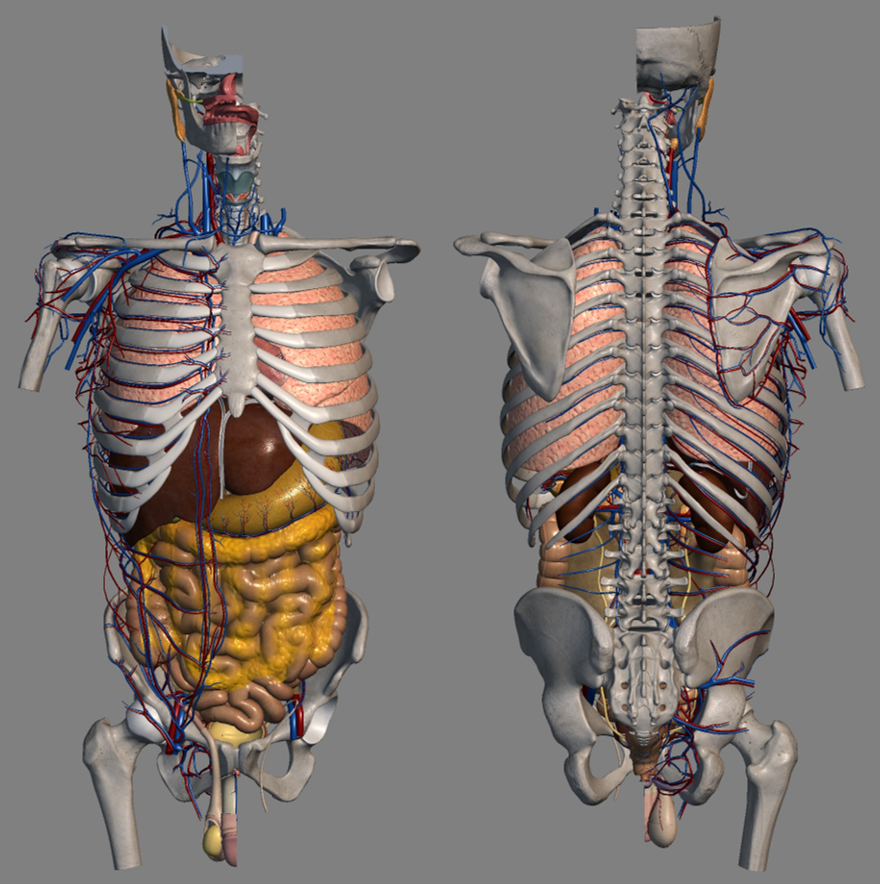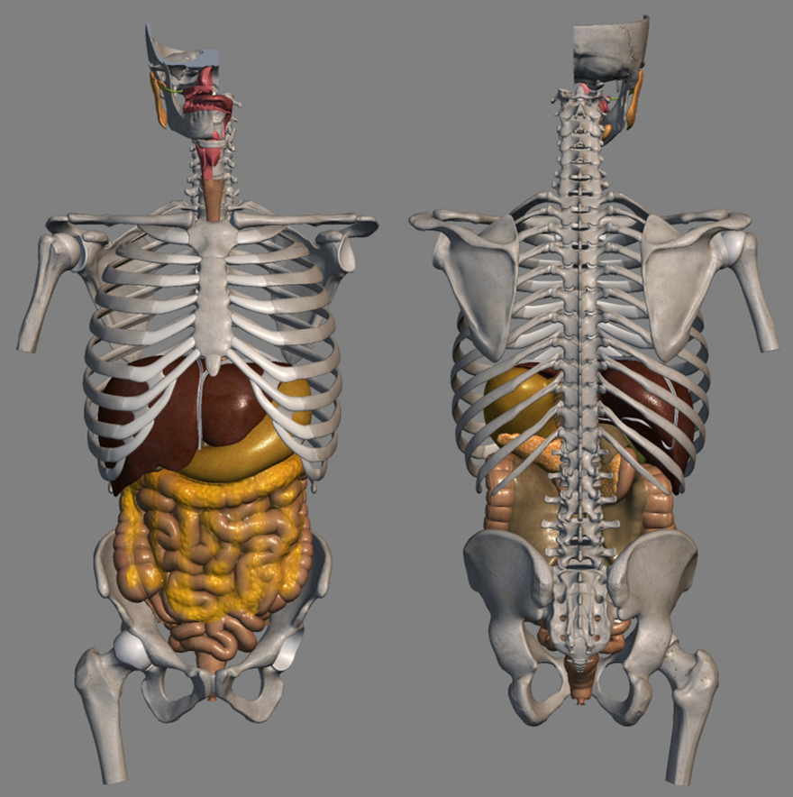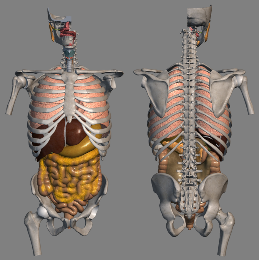 흉곽과 골반뼈 사이로 장기들이 오밀조밀하게 위치하는 것을 표현한 모식도이다. 소장 및 대장은 생략한 모습이다. (California knowledge center)