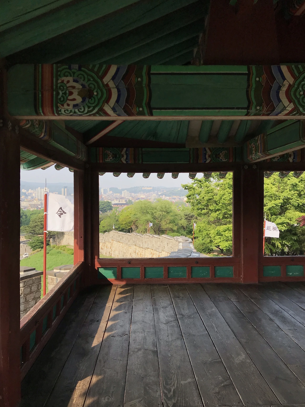 성인 20명은 충분히 다리를 뻗고 앉을 수 있을 정도의 너른 정자. 그 앞으론 화서문 주변 일대가 펼쳐져있다. 바람결이 막힘 없이 정자를 드나들었다. 4면의 정자를 둘러싸고 모서리에 하나씩 세워진 깃발에서 펄럭 펄럭 큰 소리가 났다. 센 바람에 깃발이 제 몸을 찰싹 때려가며 마구 흔들거렸다. 낯선 언어로 대화하는 그들의 말소리는 깃발 소리 뒤로 숨었다.