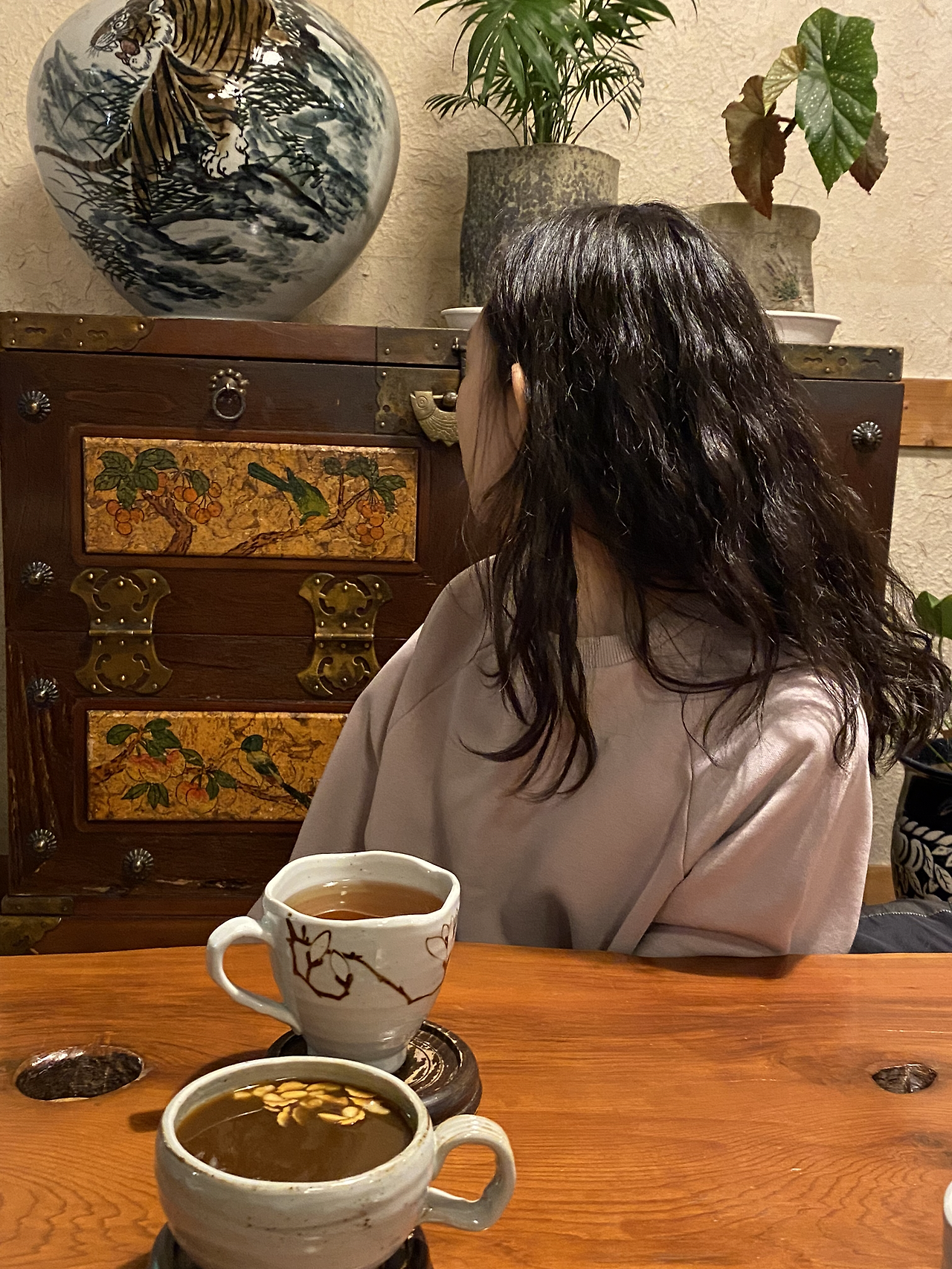 우리는 주인이 안내한 자리로 들어갔다. 2m는 되어 보이는 기다란 원목 테이블이 있는 문가의 가장 안쪽 자리. 오래된 장식장과 큰 화분 몇 개가 벽 앞을 그득하게 채우고 있다. 공간을 구경하느라 천천히 걸음 하는 내 두발이 닿은 노란색 장판에선 후끈한 온기가 일었다. “오 - 따뜻해. 좋다-” 두툼한 방석을 치우고 맨바닥에 엉덩이를 붙이고 앉았다. 두 번째 방문이었다. 첫 방문 당시엔 빈자리 없이 손님이 가득했는데도 아주 조용했다. 그래서 소리를 낮춰 말했던 기억이 있다. 일요일 오후 여섯 시에 다시 찾은 찻집엔 주인을 빼곤 우리와 젊은 커플 한 쌍뿐이었다.