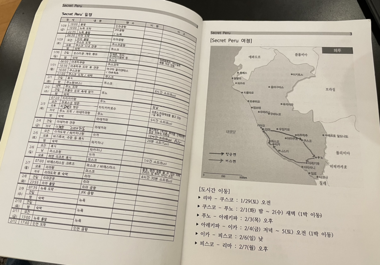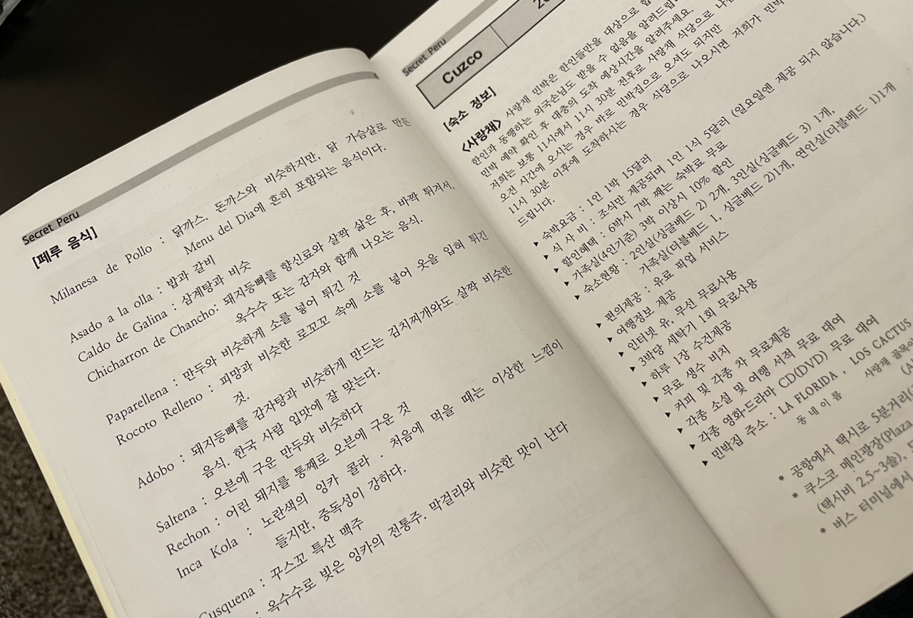 한 학기 미뤘던 논문을 쓰느라 정신없는 2010년 하반기를 보낸 후, 오랫동안 친구들과 별렀던 여행을 떠났다. 출장으로 여러 나라를 다녀온 후 술자리에서 풀어놓은 무용담들은 구체적인 여행 계획으로 바뀌었고, 홀가분한 여행으로 꼭 다시 가고 싶었던 곳들 중 페루로 첫 행선지를 정했다. 버라이어티한 기후와 문화, 지역적인 특색이 있어서 짧은 시간에 다양함과 재미를 풍부하게 느끼기 가장 좋은 곳. 2주간의 일정을 짜고 이동과 숙소 등을 계획하는 건, 그간 아는 척을 엄청 해댔던 내 몫이었고 여행사 업무를 하다 보니 가이드북까지 만드는 짓을 하고 말았다. 지금처럼 좋은 어플과 데이터 환경이 있었던 때도 아니어서 안내서가 필요했었고 특히 자꾸 묻고 기억 못 하고 자주 귀찮아하는 일행들에겐 이런 족쇄가 필요하기도 했다. 그렇게 난 여행자가 아니라 가이드가 되어 있었지만 지 좋아하는 걸... 누굴 탓하랴. 그렇게 4명에게 배포할 가이드북을 마스터 인쇄해서 나눠주고 그리운 페루로 향했다.