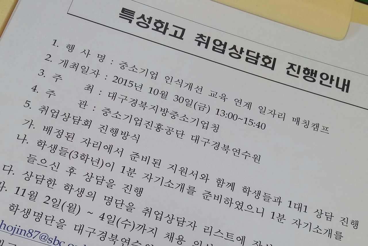 특성화고 취업상담회에 참석하게 된 건 인사담당 직원의 권유 때문이었다. 회사에 병역 특례병을 배정받으려면 실업계 고등학교와 산학협동 같은 협약이 있어야 하고 그런 과정 중의 하나가 이번 행사라는 설명이다. 행사 당일에 까맣게 잊었고 담당 직원이 출발을 재촉하는 바람에 30분 늦게 대구의 행사장에 도착했다. 각각의 테이블마다 머리를 맞대고 상담이 한참 진행 중이었다. 진행 요원의 안내로 자리에 앉으니 대구 경북지역의 특성화고 취업담당 선생님들이 찾아와 명함을 내밀었다. 이런 행사 경험이 일천한 나에 비해 수년간 학생들의 취업을 담당했을 선생님들의 질문은 핵심을 찔렀고 노련했다. 회사의 규모가 어떻고 안정정인지 복지나 급여 수준은 어떤지 근무 조건은 적합한지 빠르게 파악했고 이내 우리 회사에 관심을 가졌다. 점심시간에 구내식당에서 나와 식사를 함께한 젊은 선생은 밥은 먹는 둥 마는 둥 내게 계속 질문을 하며 메모를 했고, 자기 학교와 학생들의 우수성을 홍보하느라 열심이었다. 제자들을 꼭 좋은 회사에 취업시키고자 하는 스승으로서의 열정이 느껴졌다.