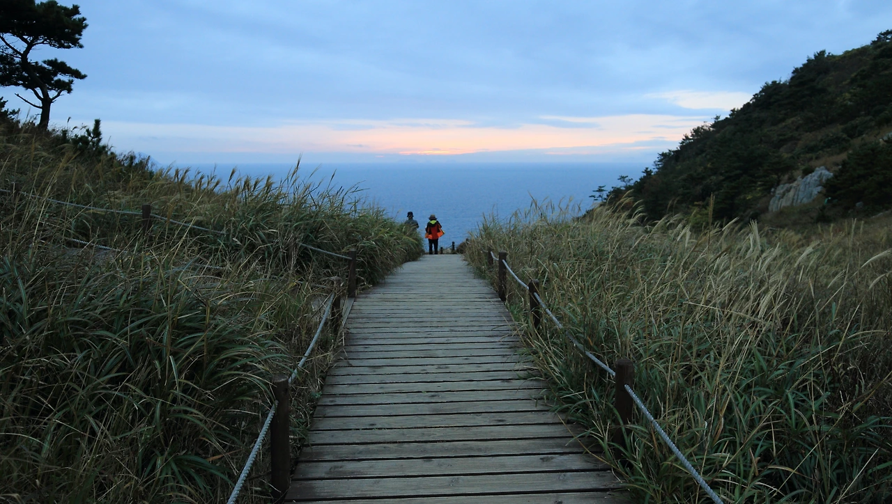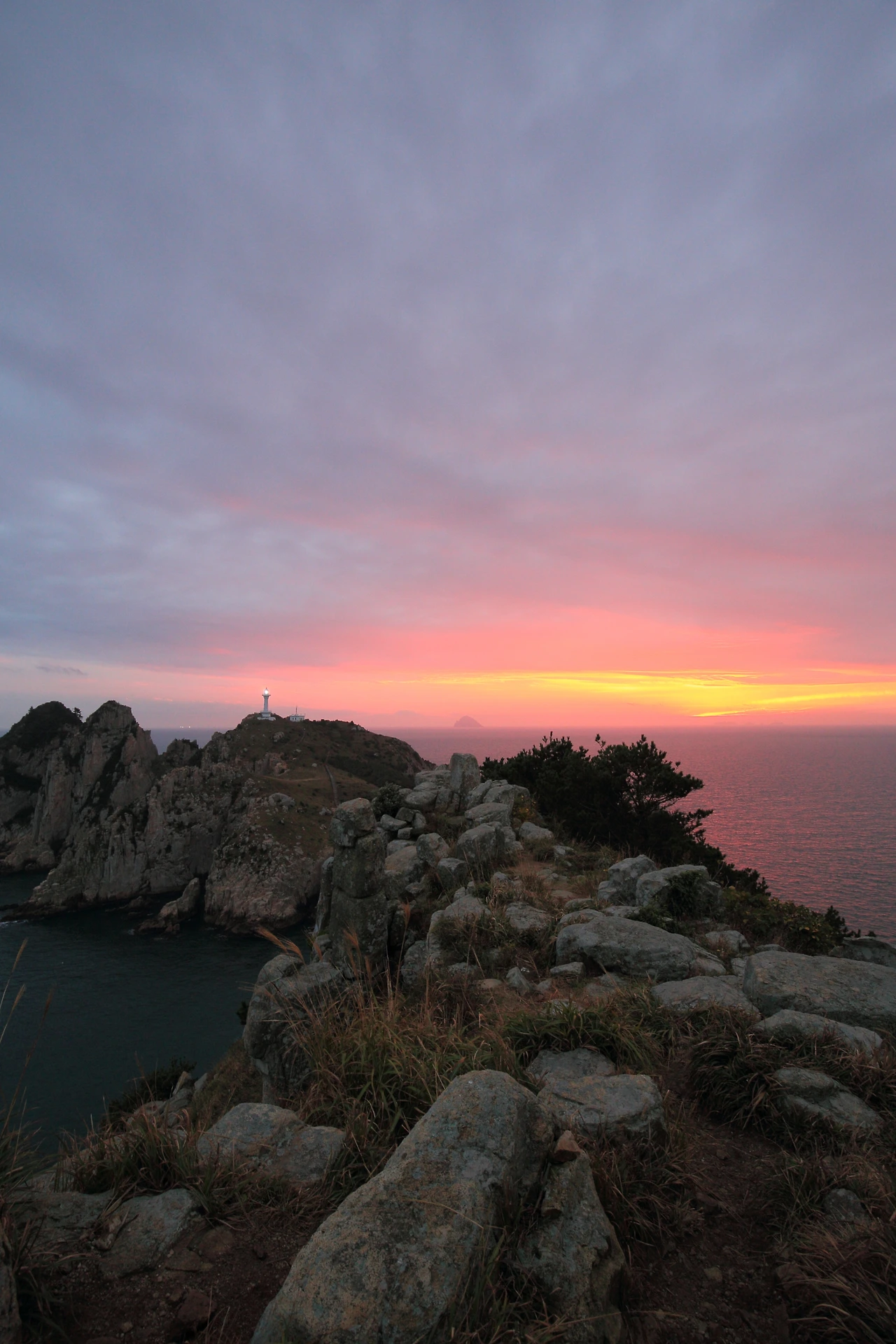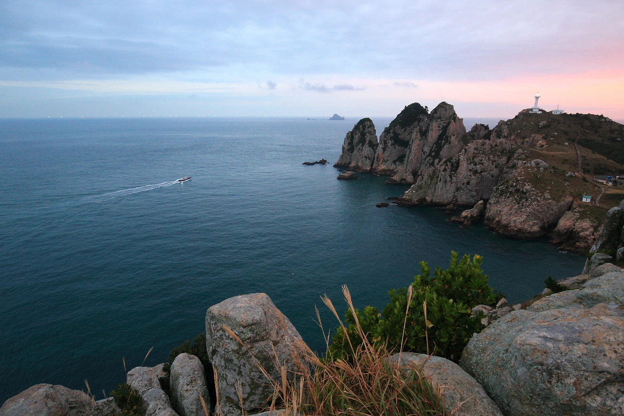가로등 하나 없는 섬길을 돌아가야 했으므로 나 역시 서둘렀다. 몸이 어느 정도 적응이 됐는지 돌아가는 길은 좀 더 수월했다. 바닷길을 건너 다시 소매물도의 계단을 올라 억새 사이로 난 언덕을 걸었다. 무엇 때문인지 문득 지나온 길을 되돌아봤을 때 그곳에 노을이 지고 있었다. 적당한 포인트를 찾아 정신없이 셔터를 눌렀다. 원하던 만큼의 해넘이는 아니지만 섬의 서쪽 하늘을 오렌지 빛으로 물들였고 바다를 붉게 염색했다. 일몰시간에 맞춰 등대가 불빛을 뿜었다. 쿠크다스 광고에서처럼 챙이 넓은 모자를 쓴 아름다운 여인이 치마를 팔락이며 바위 위에 서서 등대를 향해 손짓하는 뒷모습이 담겼다면 더 없이 좋았겠지만 현실에서는 잘 일어나지 않는 일이다.