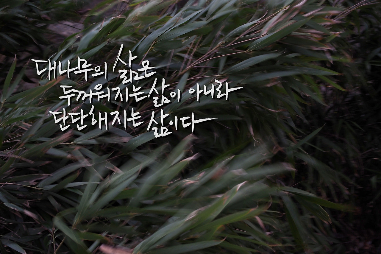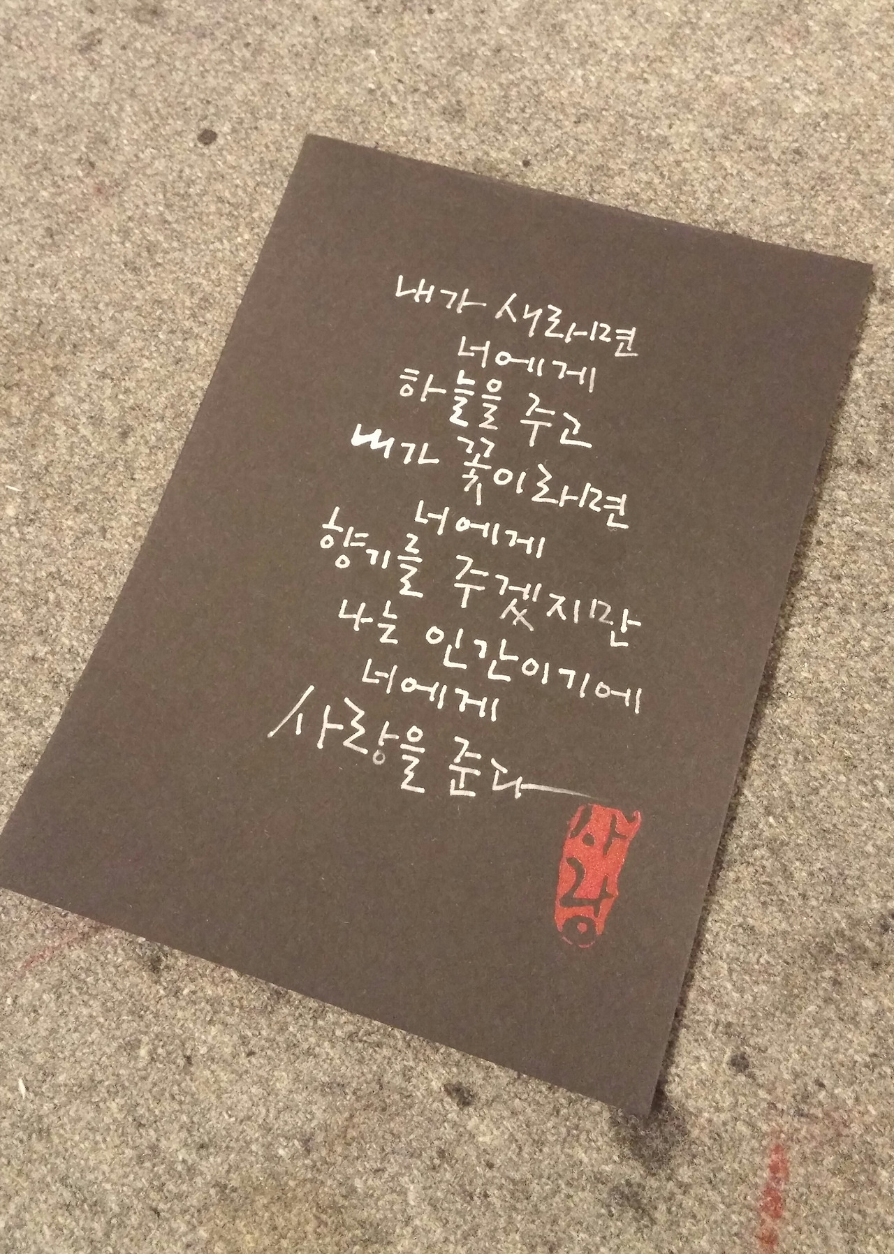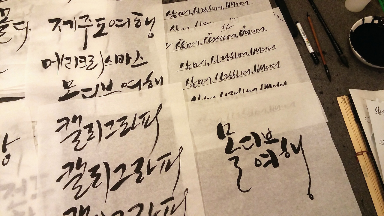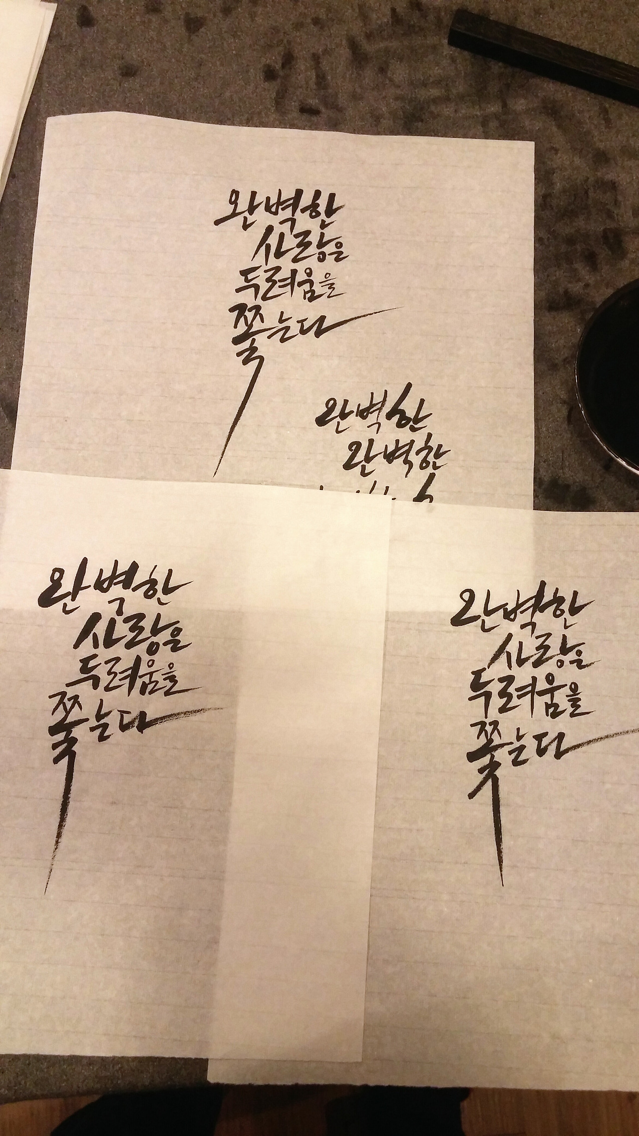 주변 사람들이 내 글씨와 사진에 찬사를 이어갔다. 그럴수록 더 많이 자주 열심히 썼고 어느 날 서점에 가 보니 캘리그래피 관련 서적들이 매대 한 테이블을 가득 메우고 있었다. 바야흐로 캘리그래피의 전성시대가 열린 듯 보였다. 마음에 드는 책들을 사서 독학을 하던 나는 한계를 느끼고 대구의 캘리그래피 전문 학원에 덜컥 등록을 해 버렸다. 수업은 일주일에 한 차례 3 시간씩 진행됐다. 학원에 처음 가서 당황했던 건 펜을 이용한 글씨를 가르쳐 줄 걸로 생각했는데 붓과 먹 그리고 화선지를 나눠 줬다.