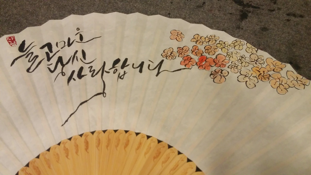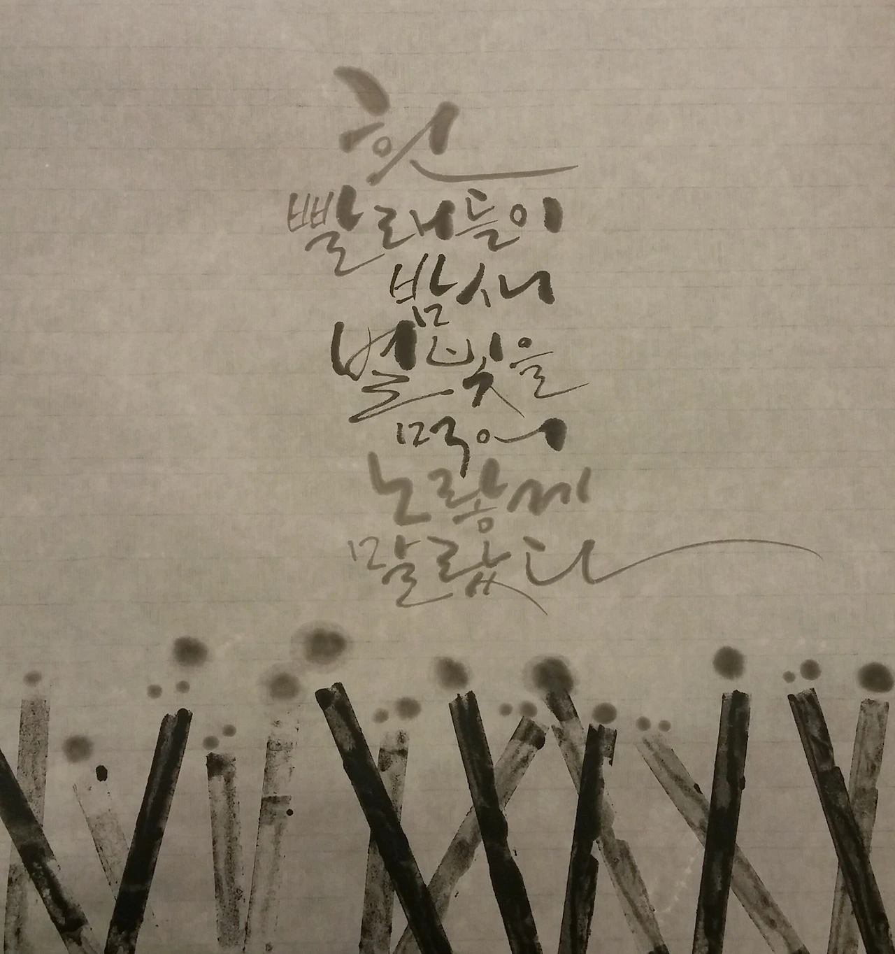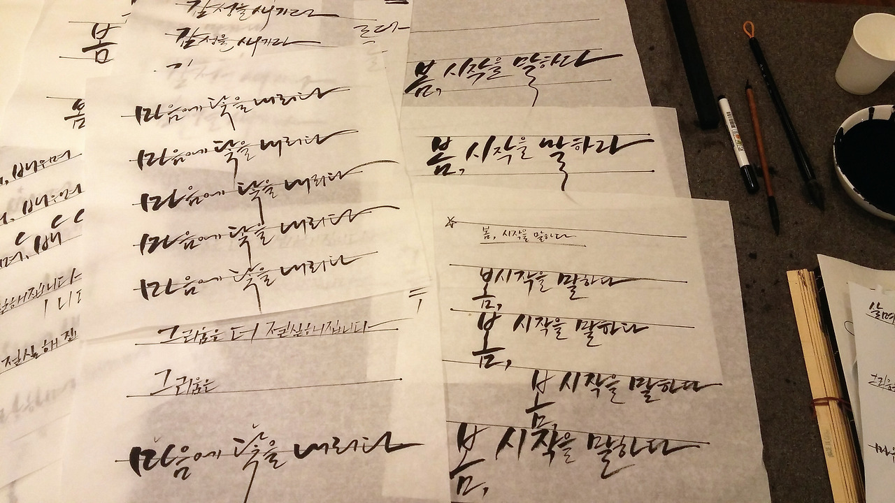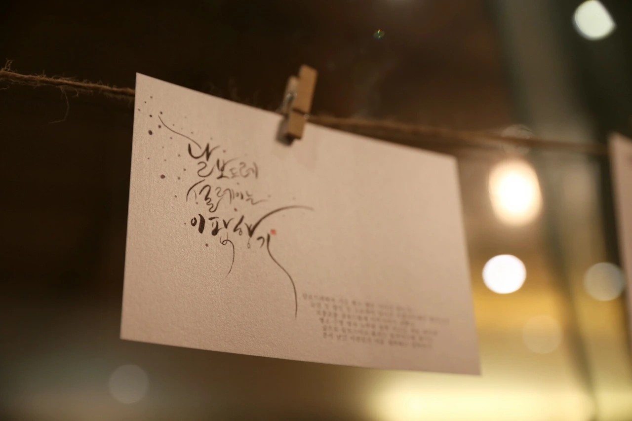 주변 사람들이 내 글씨와 사진에 찬사를 이어갔다. 그럴수록 더 많이 자주 열심히 썼고 어느 날 서점에 가 보니 캘리그래피 관련 서적들이 매대 한 테이블을 가득 메우고 있었다. 바야흐로 캘리그래피의 전성시대가 열린 듯 보였다. 마음에 드는 책들을 사서 독학을 하던 나는 한계를 느끼고 대구의 캘리그래피 전문 학원에 덜컥 등록을 해 버렸다. 수업은 일주일에 한 차례 3 시간씩 진행됐다. 학원에 처음 가서 당황했던 건 펜을 이용한 글씨를 가르쳐 줄 걸로 생각했는데 붓과 먹 그리고 화선지를 나눠 줬다.