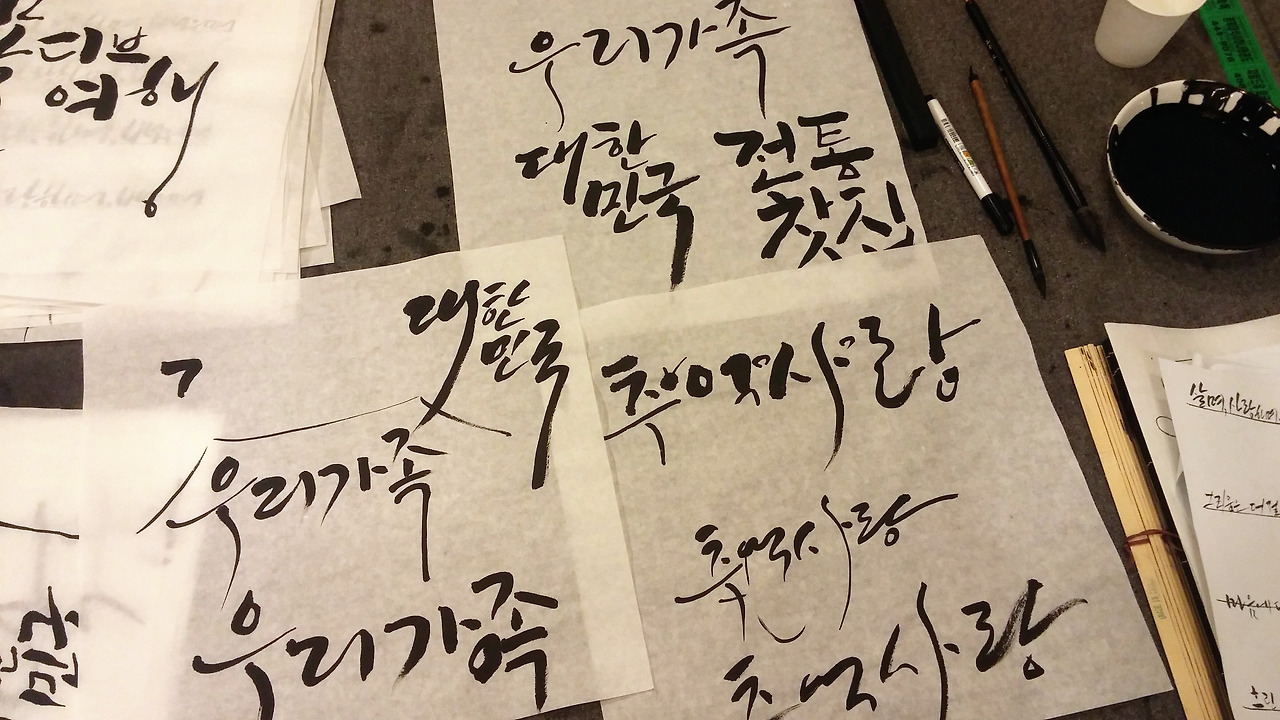 먹을 붓에 듬뿍 묻혀서 화선지에 글씨를 쓰는 형식은 전통 서예와 다를 바 없었다. 서예를 경험했던 사람이라면 캘리그래피에 입문하는데 있어서 훨씬 수월하게 접근할 수 있을 테다. 서예는 이미 정립된 서체를 그대로 익혀서 재현하는 과정이라면, 캘리그래피는 붓과 먹을 다루는 법을 익혀서 자유롭고 창의적으로 표현한다는 점이 다르다고 할 수 있다. 캘리그래피는 붓과 먹을 기본으로 하되 다양한 재료들을 이용한다. 각종 펜은 물론이고 롤러나 나무젓가락 등 기발한 도구를 이용하여 서체의 한계를 재료의 다양함으로 뛰어넘는다. 사진도 좋지만 간단한 그림과 어우러지면 글씨가 더욱 돋보인다.