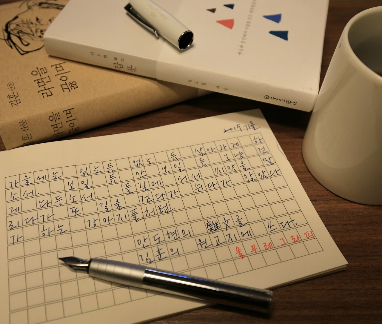 글씨는 어느 때는 마음에 들기도 하고 또 어찌 보면 영 마음에 차지 않았는데, 틈 나는 대로 펜을 이용해서 여러 노트에 글씨를 썼다. 처음엔 남의 글씨를 똑같이 베껴 쓰는 일도 쉽지 않았다. 무엇보다 필압을 이용하여 획의 두께를 조정하는 일이 어려웠다. 필기구에 문제가 있나 싶어 검색을 해 보니 딥펜의 종류가 무궁무진하게 많았는데 그 역시 되는대로 사 모았다. 그러다 보니 어느새 내 필통은 각종 필기구로 넘쳐 났고 각종 잉크 류가 책상을 가득 채워졌으며 다양한 종류의 노트가 쌓여갔다.