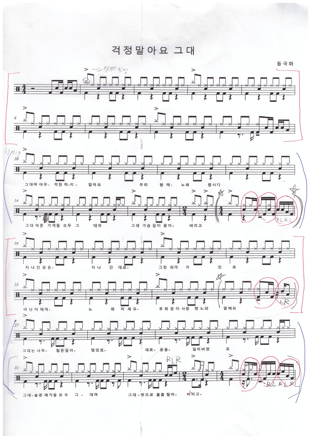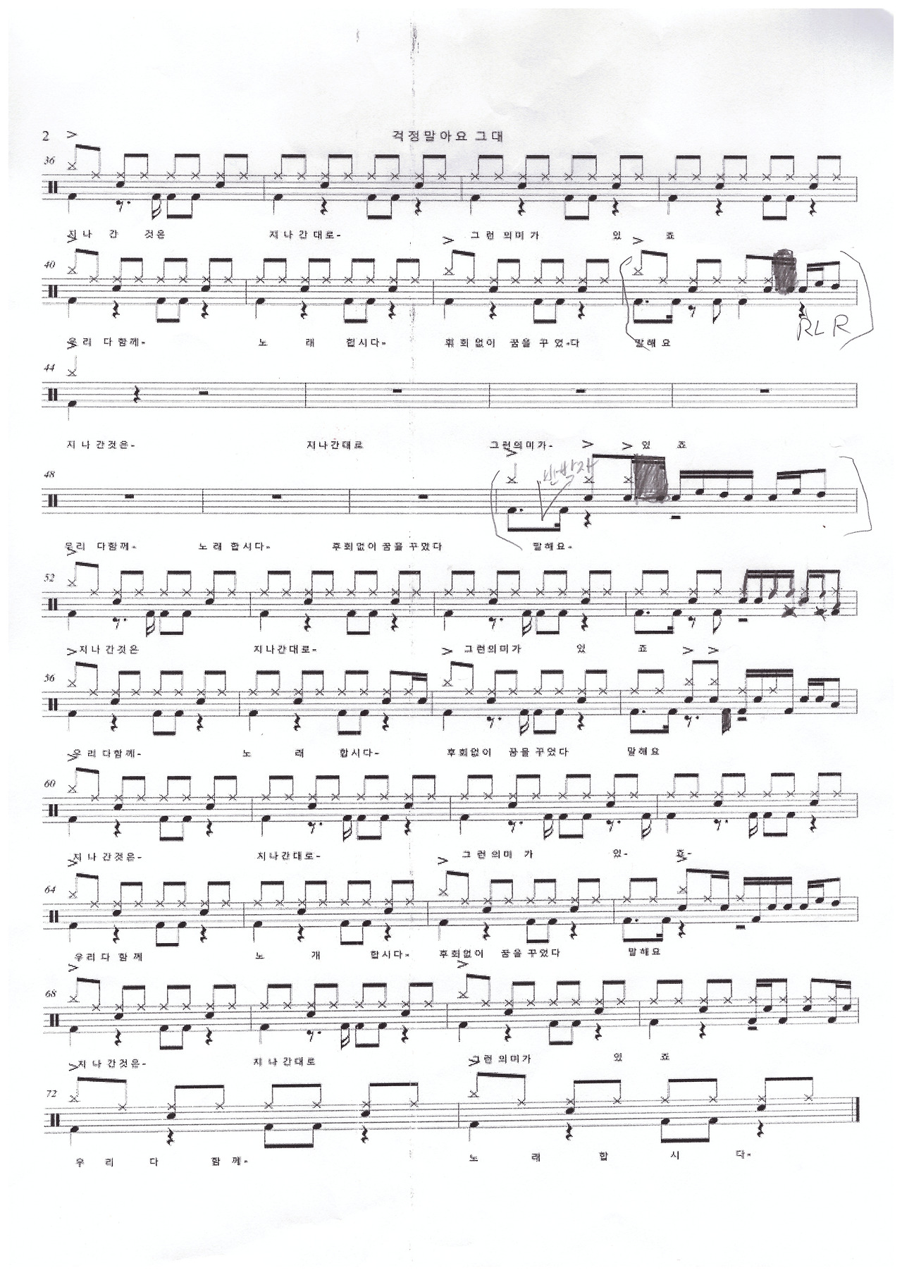 전인권이 특유의 쉰 목소리로 '에히~ 에~'라고 포효하며 곡의 시작을 알린 후, 쿵따쿵따다둥~ 쿵치따치쿵쿵따치~로 시작하는 '걱정말아요 그대'의 전주 부분은 묘한 긴장감을 준다. 전인권은 곡 내내 걱정 말라며 위로하지만 드럼 스틱을 난생처음 만져 본 내게는 이 곡의 연주를 해내야 할 걱정이 차고 넘쳤다.