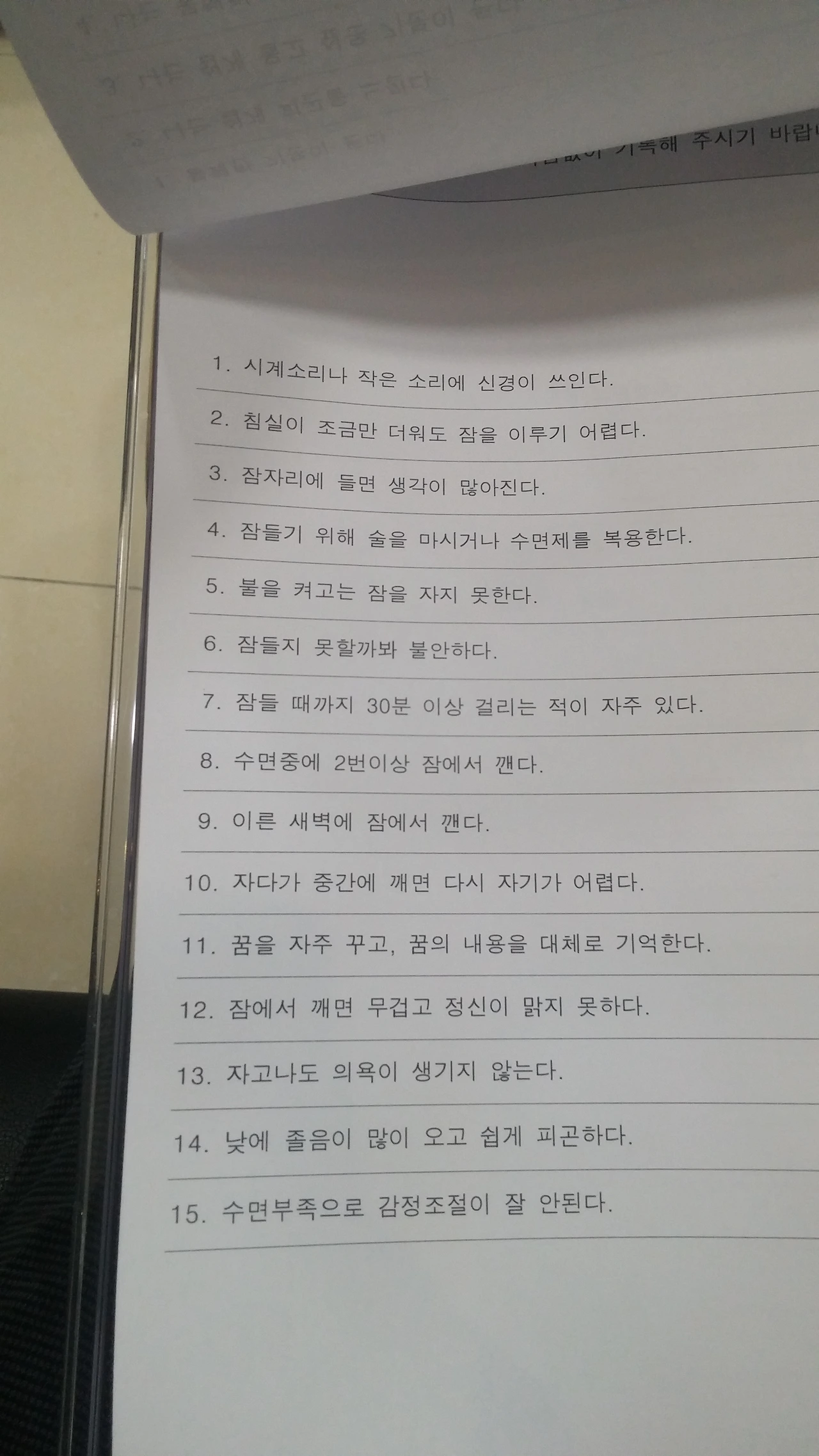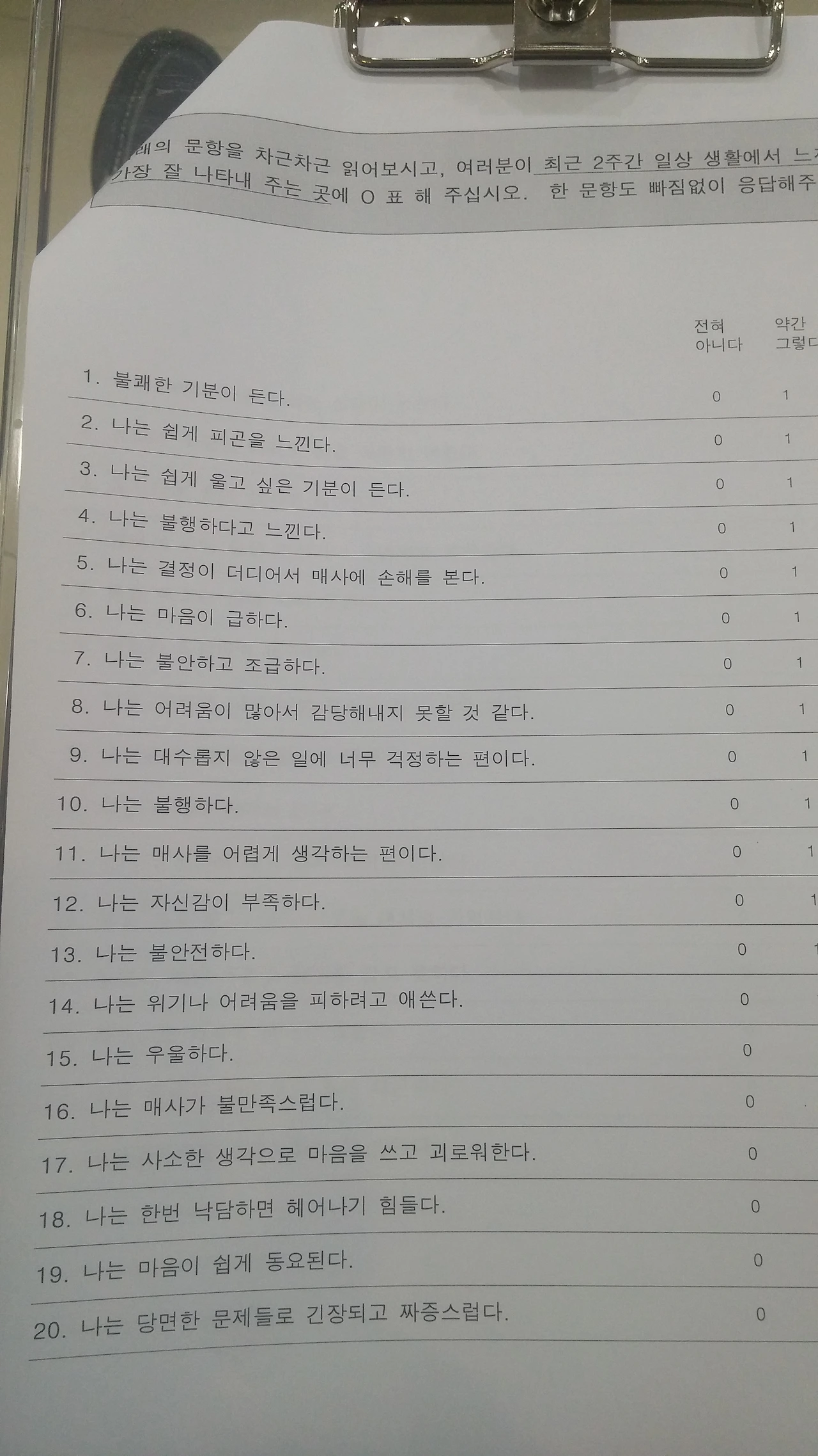 정신과 의원은 겉 보기에 접수 데스크, 진료실, 방사선실, 원무과 등 다른 병원의 인테리어와 흡사하다. 대기실 곳곳에 놓인 양키캔들이 여린 불빛과 함께 희미한 향을 내뿜고 있는 게 눈에 띄는 정도다. 환자들 몇몇이 대기하고 있거나 링거를 꽂은 채 복도를 오간다. 대기자나 환자들의 눈빛이 생경하게 느껴진다. 선입견일 것으로 치부하며 그들로부터 시선을 거둔다. '접수' 자리에 앉은 50 대로 보이는 여직원이 내 준 질문지의 55 개 문항에 체크를 했다. '전혀아니다' '약간그렇다' '보통그렇다' '매우그렇다'의 네 개 항목 중 하나에 표시를 해야 한다. 운전면허 필기시험 이후 가장 신중하게 답(?)을 골랐다. 쉽게 선택할 수 있는 질문도 있는 반면에 고르기 애매한 항목도 많다. 가령 '무슨 일을 하든 정신을 집중하기가 힘들다' 또는 '내 인생은 실패작이라는 생각이 들었다'같은 질문은 선택이 쉬운 반면, '불행했다' '우울했다' '슬픔을 느꼈다'같은 항목은 막연했다. 지난주에 질 좋은 소고기를 많이 선물 받아 행복했지만, 누구랑 먹을지를 놓고 두 그룹 사이에 갈등하는 과정은 불행했고, 결국 직원들과 맛나게 먹고 딸아이와 또 먹어서 다시 행복했으나, 설거지하는 동안은 허리가 아파서 불행했으니 이것이 불행인가 행복인가. 위 네 가지 답 중에 대체 뭘 선택해야 한다는 말인가. 어쨌든 최선을 다해 답을 고르는 동안 내 뒤의 환자가 나를 앞서서 진료실로 먼저 들어갔다. '약간' '불행하다'라는 기분이 든다.