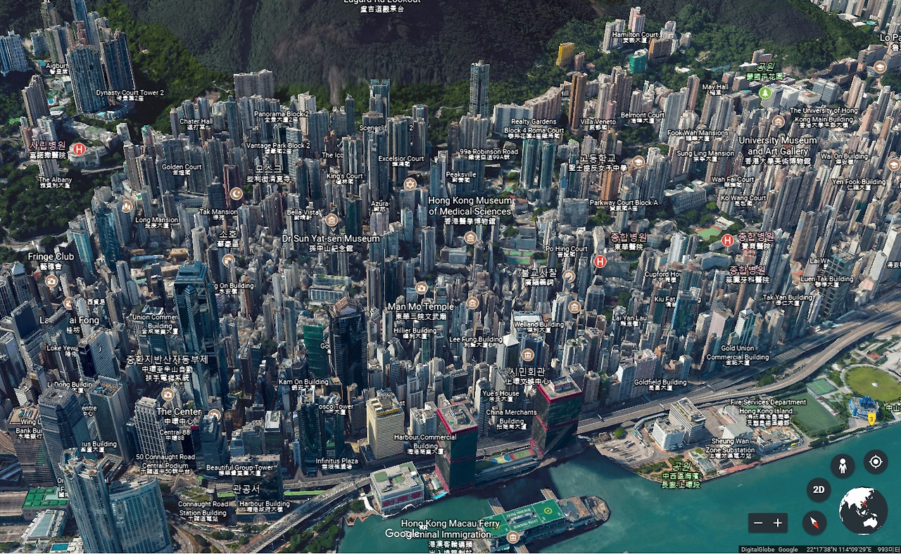 홍콩의 지형은 부산과 같아서 바다를 낀 해변에는 약간의 평지가 있지만 그 뒤로는 곧 가파른 언덕이 시작된다. 거주나 통행이 가능한 땅에는 모조리 높은 빌딩을 세워 놓았는데, 마치 좁은 화기에 담긴 플로랄폼에 길고 뾰족한 식물만을 골라 빈틈없이 정밀하게 꽂아놓은 꽃꽂이 화분과도 같은 형상이다. 에스컬레이터에서 내려서 좁은 통로를 지나 엘리베이터를 탔다. 우리가 탄 곳은 G 층(그라운드 층)이며 내린 곳은 3 층이다. 목적하는 건물은 아직도 먼 산등성에 위치했다. 3 층에서 내리니 그 뒤를 다시 높은 빌딩이 막아선다. 아래쪽 건물의 3 층은 바로 뒤편 위쪽 건물의 G 층이다. 다시 그 위의 건물은 아래쪽 빌딩의 3 층 또는 4 층, 이런 식으로 구역 내의 모든 빌딩이 연결돼 있다. 이런 루트를 모른 채 높은 곳에 위치한 건물을 도보로 찾는다면 가파른 홍콩 생활을 포기해야 할지도 모른다. 홍콩은 도로 또한 중첩되어 있다. 지상의 도로 밑으로 지하차도가 지나며, 다시 머리 위로 고가도로가 지난다. 고가도로 사이로는 건물과 건물을 잇는 육교가 거미줄처럼 이어져 예의 밀집된 인파가 이동한다. 그도 모자라서 승객을 가득 태운 2 층 버스와 2 층 트램이 도로 위를 교차한다. 홍콩은 만랩을 찍은 심시티의 초고수가 이룩한 가상도시를 실제로 재현한 현실 버전 도시다.