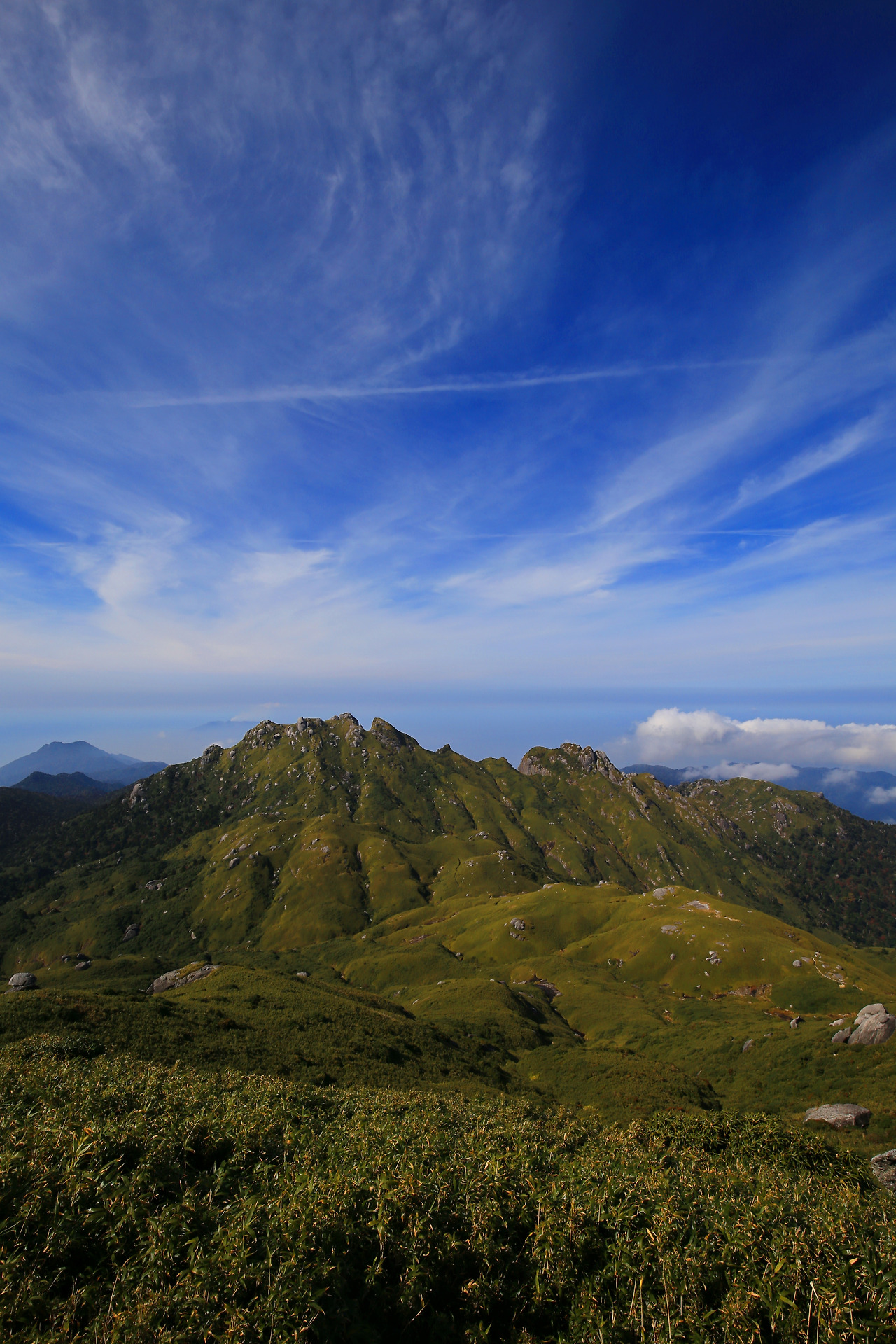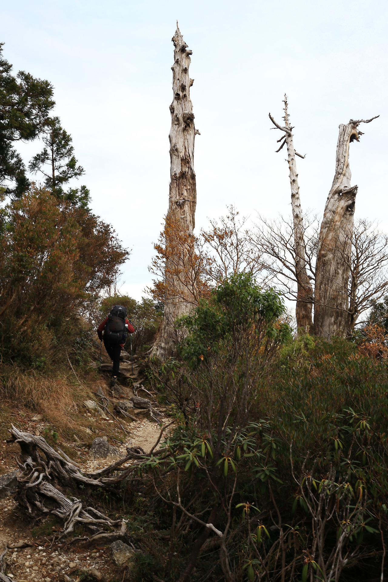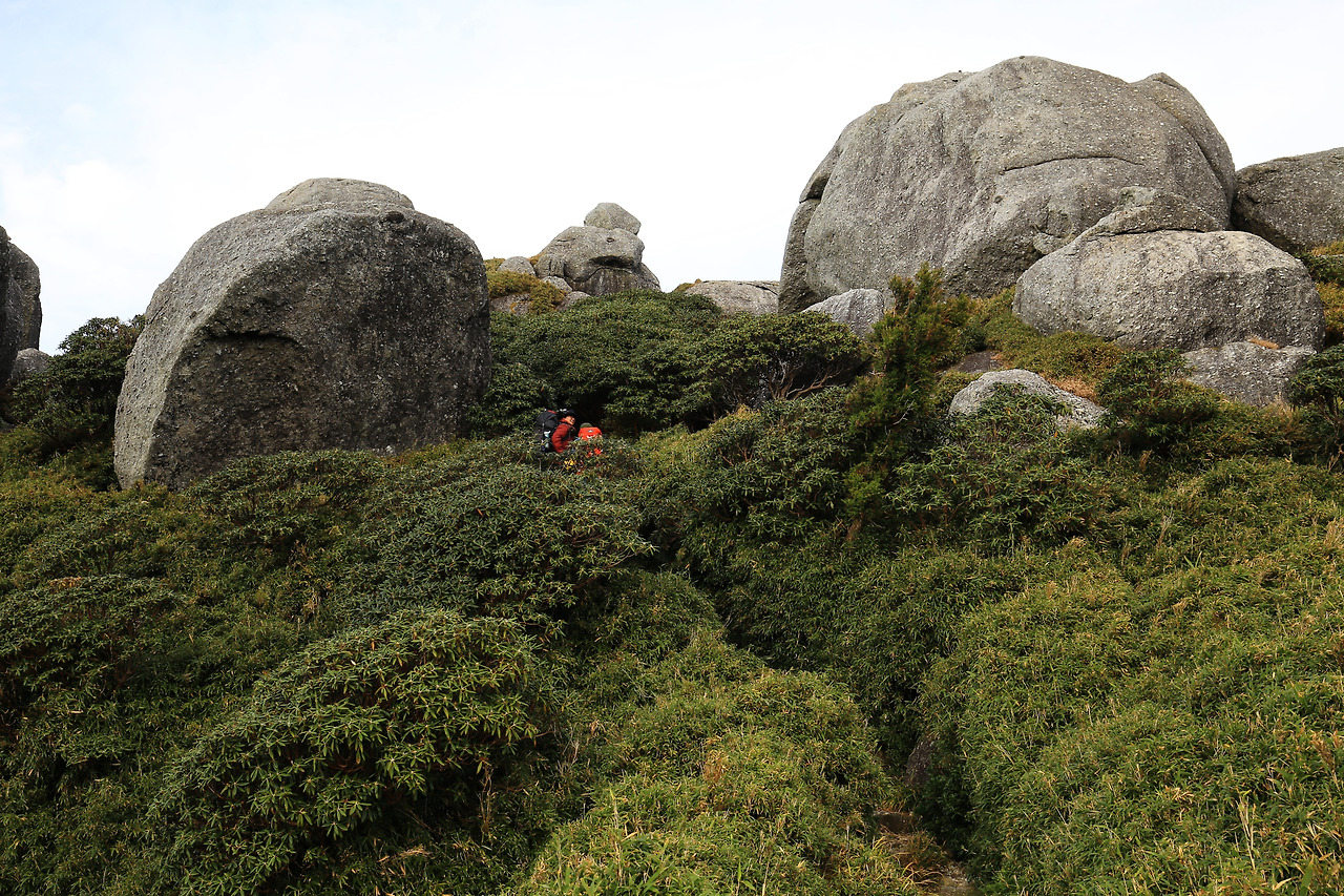 오르는 길에는 녹차밭처럼 관목이 빼곡했고 트래킹족들은 주로 그 사이를 지난다. 어떤 길은 관목의 높이가 허리춤에 닿았고 때로는 내 키를 훌쩍 넘는 크기로 도열했다. 아침과 점심은 민박집에서 싸 준 도시락을 길 위에서 먹었는데 찰진 주먹밥을 마른 목으로 삼키기 어려웠다. 정상이 가까워질수록 다리는 무거웠지만 시야는 트였다. 야쿠시마의 산은 봉우리마다 바위를 이고 있다. 바위들은 때론 노부부가 마주 보는 형상으로, 때론 고다마의 모습처럼 보이기도 했고 저마다 개성이 넘쳤다. 나는 이번 산행을 앞두고 유튜브를 통해 연마한 각종 등산 기술인 스틱사용기법, 상황별 보행기법, 음식물 섭취법 등을 실전에서 현란하게(?) 구사했다. 그러나 아무리 훌륭한 기술로도 날렵한 몸매와 가벼운 발걸음으로 산을 오르는 30대 젊은 친구들의 체력을 따라잡기 힘들었다.