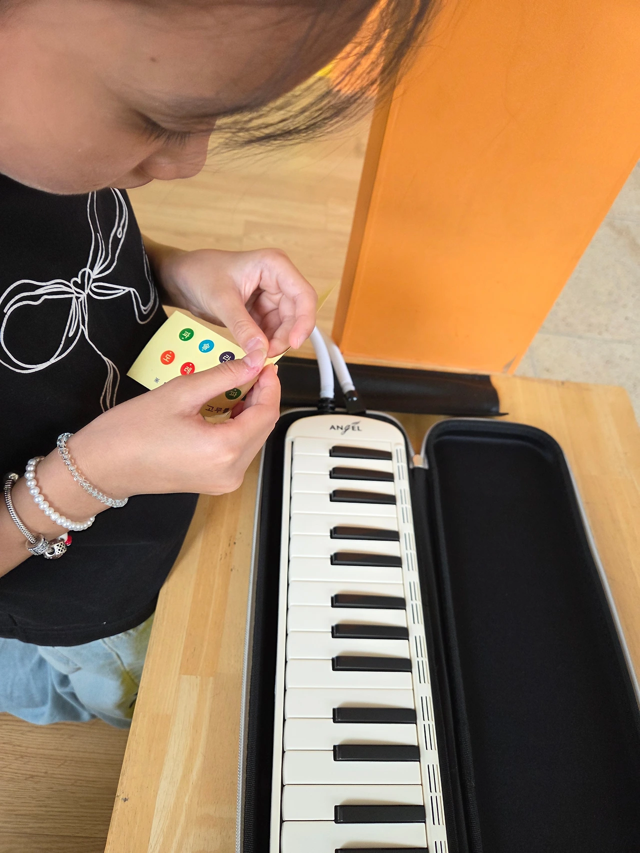 역시 이해력 빠른 그녀는 호수를 꽂자마자 신나게 불어댄다. 피아노보다 건반수도 적고, 건반 크기도 작지만 그녀는 신이 났다. 연신 불더니 숨이 찬다며 헉헉 거리는 모습도 귀여웠다. 건반에 계이름을 붙이고 몇 번 불고 정리하는 방법을 알려주니 수업 끝.