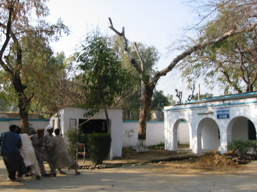 이런 건 건축이랄 것도 없는데, 설상가상 바로 옆에 있는 고목이 건물 위로 쓰러져 내리려고 한다. 그래서 파키스탄군 운전병, 취사병이 다 달라붙어 밧줄을 걸어 아예 반대편으로 넘어뜨리려고 한다. 이것도 여의찮다. 역부족이다.