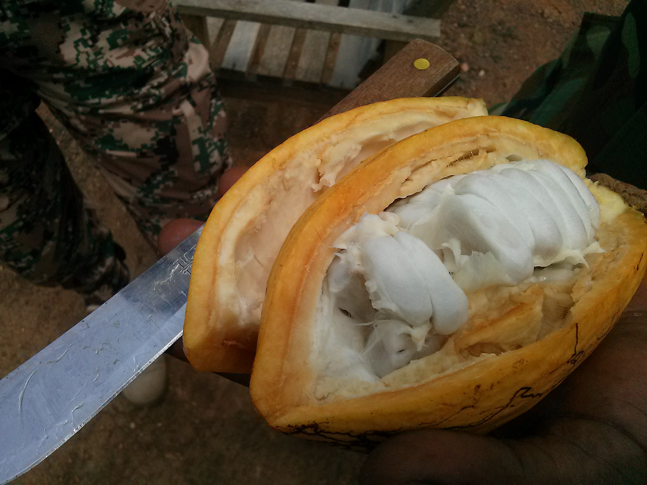 카카오 열매는 아몬드보다 컸는데, 우리에게 익숙한 초콜릿 본고장인 가나 출신 마와가 열매를 잘라 열어 보여줬다. 연한 초록빛을 띤 카카오는 익으면서 옅은 노란색으로 변하는데 열면 하얀 크림에 쌓인 씨가 수십 개 들어있다.