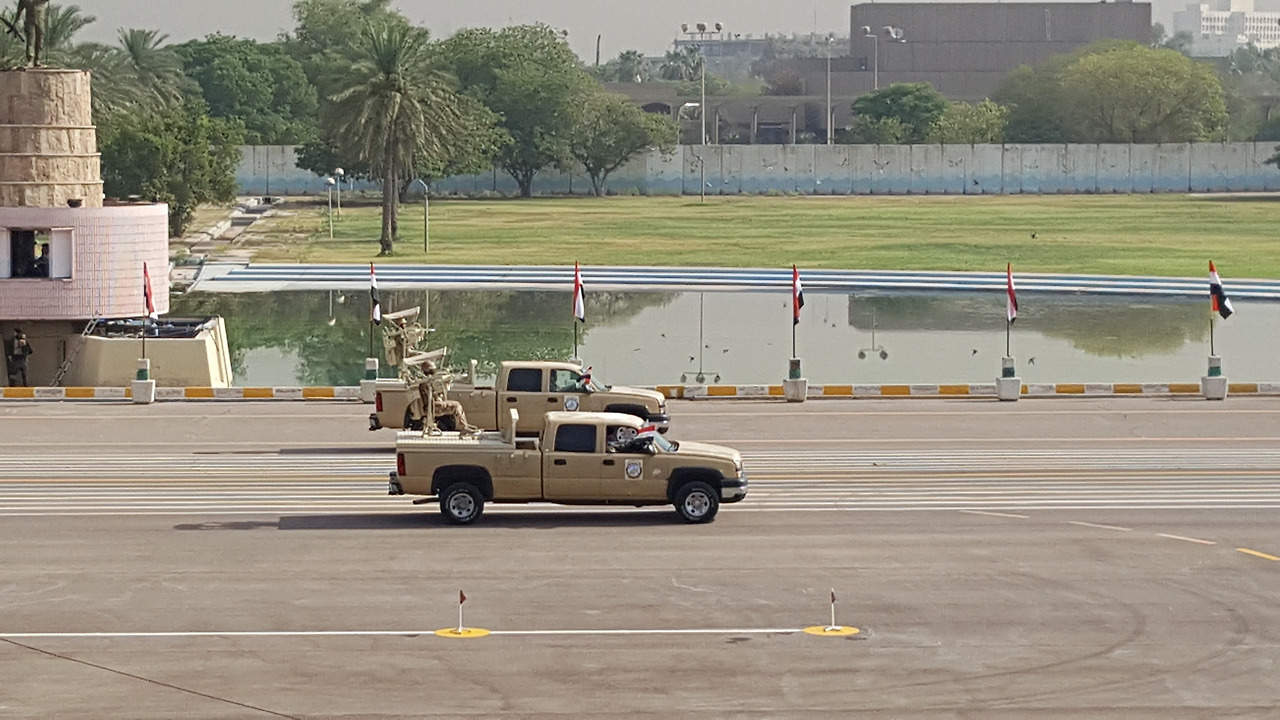 특히 이라크 특수부대인 일당백의 대테러부대는 뜀걸음으로 사열대를 통과하는, 행진의 통념을 깨는 진귀하고 인상적인 장면을 연출했다. 그 뒤를 따라 이번에는 말이 뛴다. 하하! 기마대, 점점 빨라진다. 이어서 헬기가 굉음을 내며 날아간다.