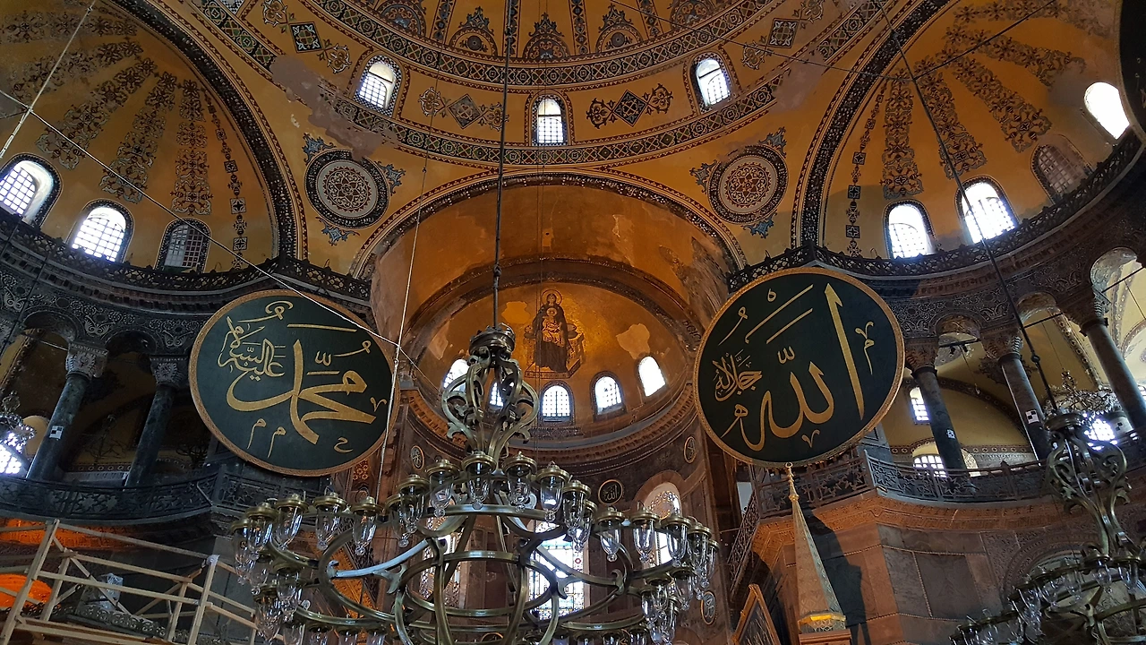 튀르키예 이스탄불의 하기아 소피아 박물관-현재는 에르도안 대통령에 의해 모스크로 바뀌었지만-에서는 알라와 무함마드, 그리고 4대 칼리프의 이름이 새겨진 둥근 원판을 볼 수 있다.