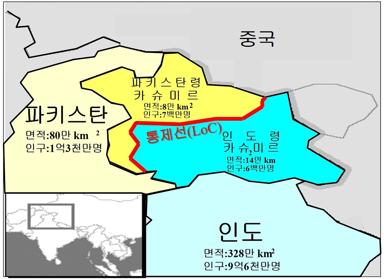 이 전쟁은 1948년 유엔의 개입으로 일단락되었으나, 카슈미르는 인도와 파키스탄 간의 분쟁지역으로 남게 되었다. 유엔은 당시 진출선에서 양측이 휴전토록 했는데 이것이 현 통제선Line of Control (또는 휴전선)의 시초가 되었다.